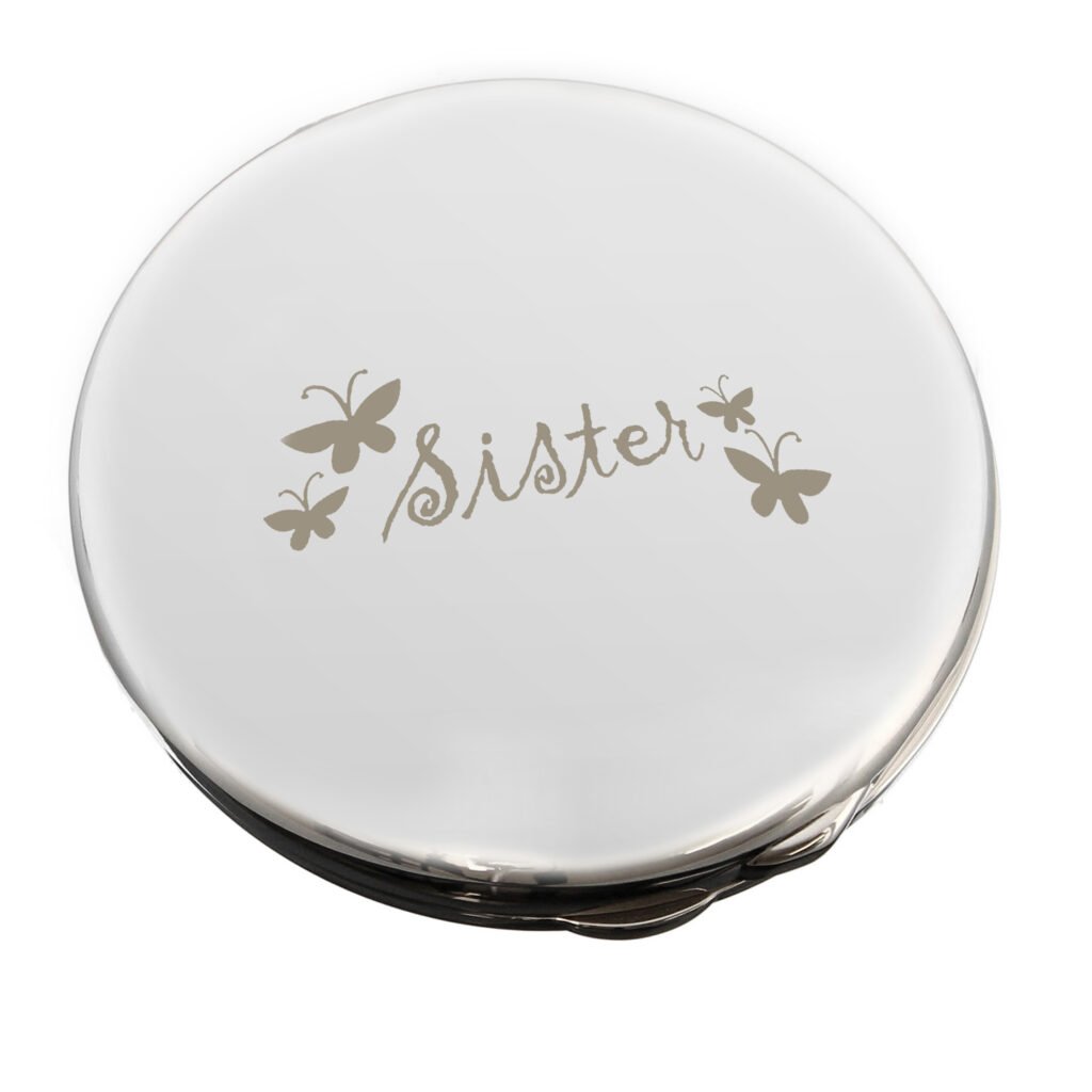 £12.99’Sister’ Butterflies Motif Round Silver Nickel Plated Compact Mirror