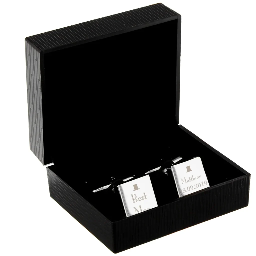 Personalised ‘Best Man’ Decorative Top Hat Motif Wedding Silver Rhodium Plated Square Cufflinks