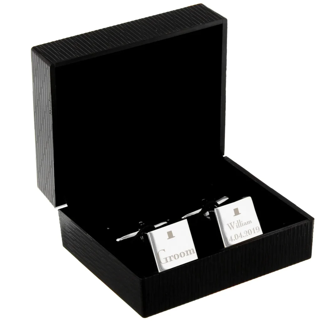 Personalised ‘Groom’ Decorative Top Hat Motif Wedding Silver Rhodium Plated Square Cufflinks