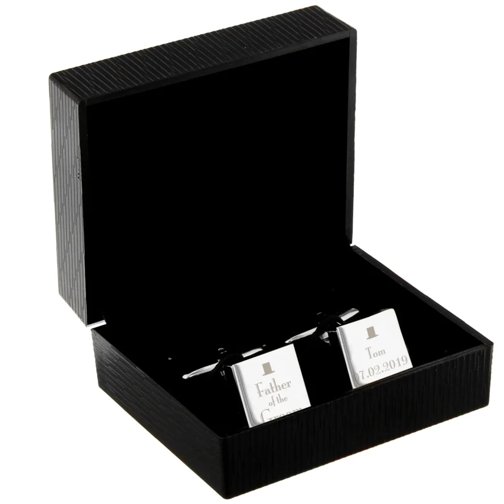 Personalised ‘Father of the Groom’ Decorative Top Hat Motif Wedding Silver Rhodium Plated Square Cufflinks