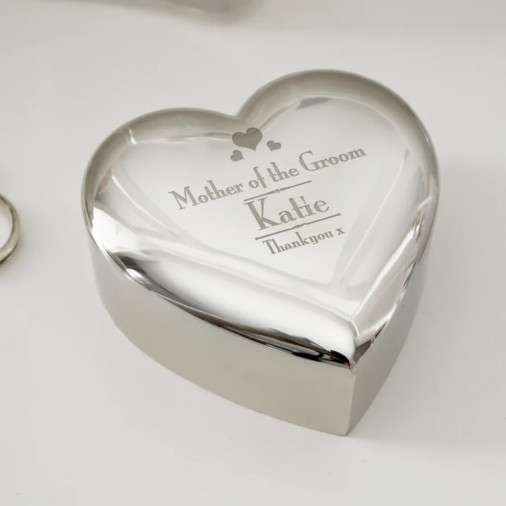 Personalised ‘Mother of the Groom’ Decorative Hearts Motif Wedding Heart Shaped Silver Nickel Plated Trinket Box