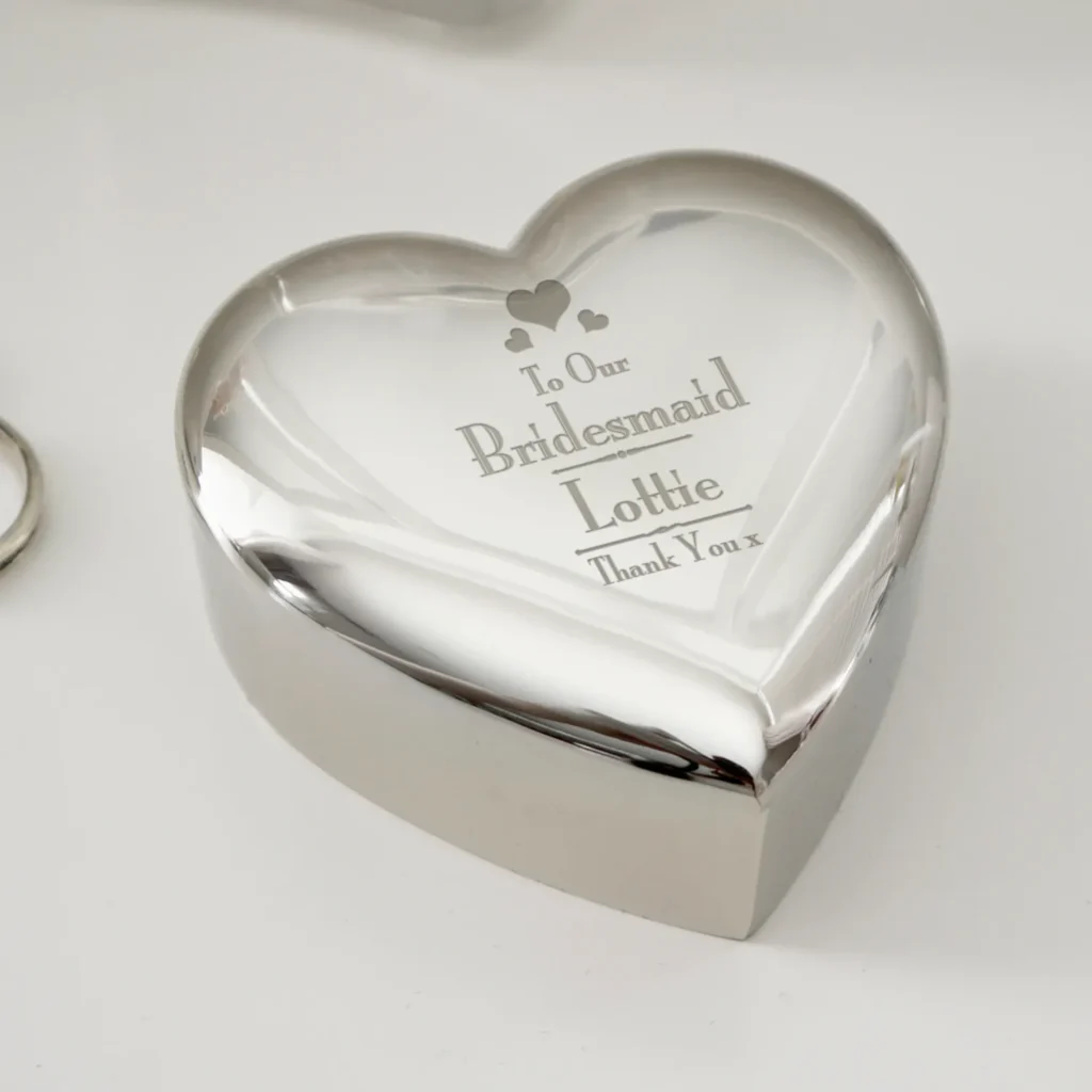Personalised ‘Bridesmaid’ Decorative Hearts Motif Wedding Heart Shaped Silver Nickel Plated Trinket Box
