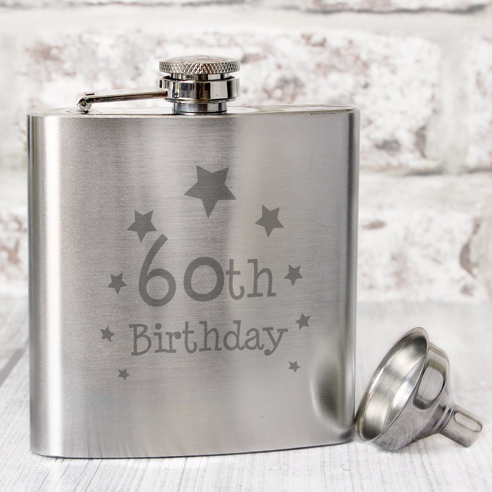 ’60th Birthday’ Stars Motif Stainless Steel Hip Flask