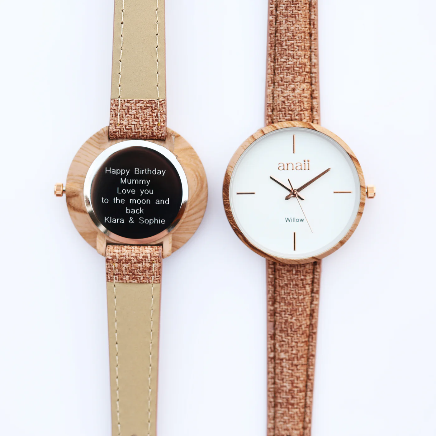 Elegance meets modern minimalism with the Anaii Ladies Hazel Wood Watch. Designed to delight with its crisp white face and soft pastel strap, this contemporary timepiece makes the perfect stylish accessory or meaningful personalised gift. Each watch arrives in a beautifully presented Anaii branded gift box with a protective pouch, ready to impress.