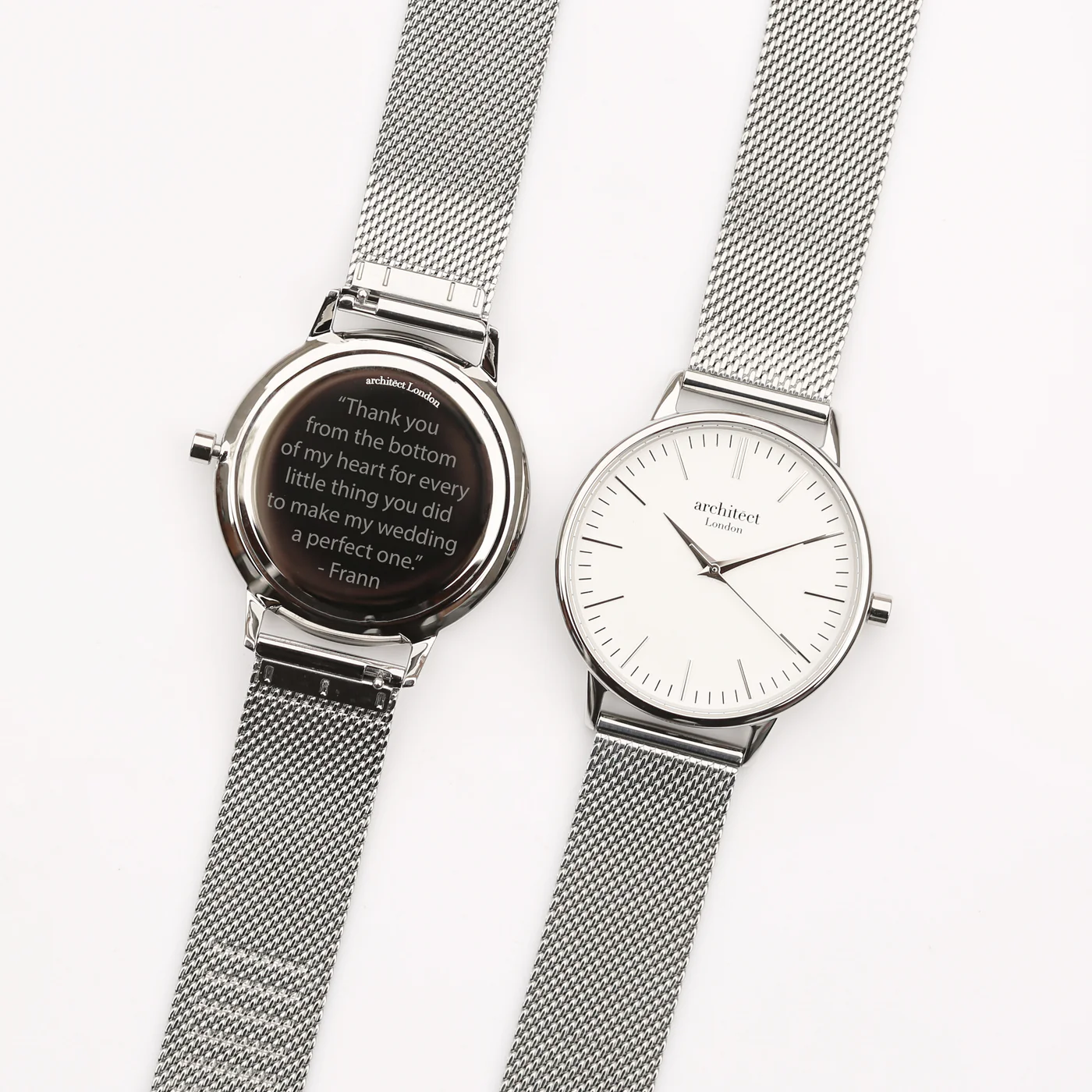 Crafted with a refined stainless steel case, a luxurious silver mesh strap, and a precise quartz movement, this watch is as reliable as it is visually stunning. What makes it even more special? The ability to personalise the back with your own actual handwriting, transformed into a premium engraving using Architect’s state-of-the-art technology.