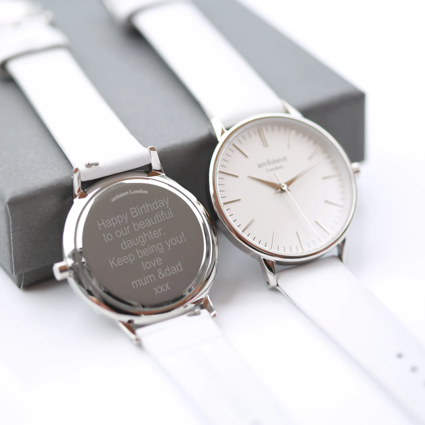 The back of the watch features a dedicated engraving area, expertly designed for a personalised message of your choice. Simply provide your wording and our specialists will engrave it in a sleek, modern font—creating a meaningful, bespoke touch.