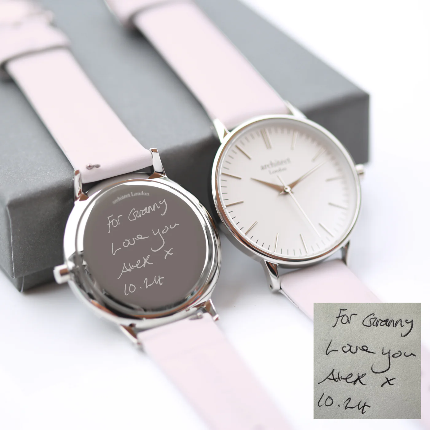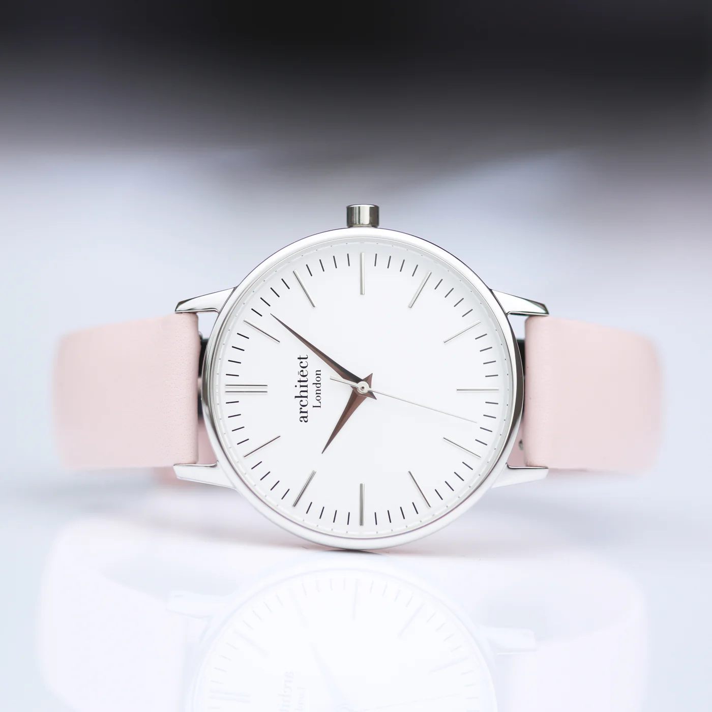 Architect London Ladies Own Handwriting Blanc Watch With Silver Bezel + Pink Leather Strap
