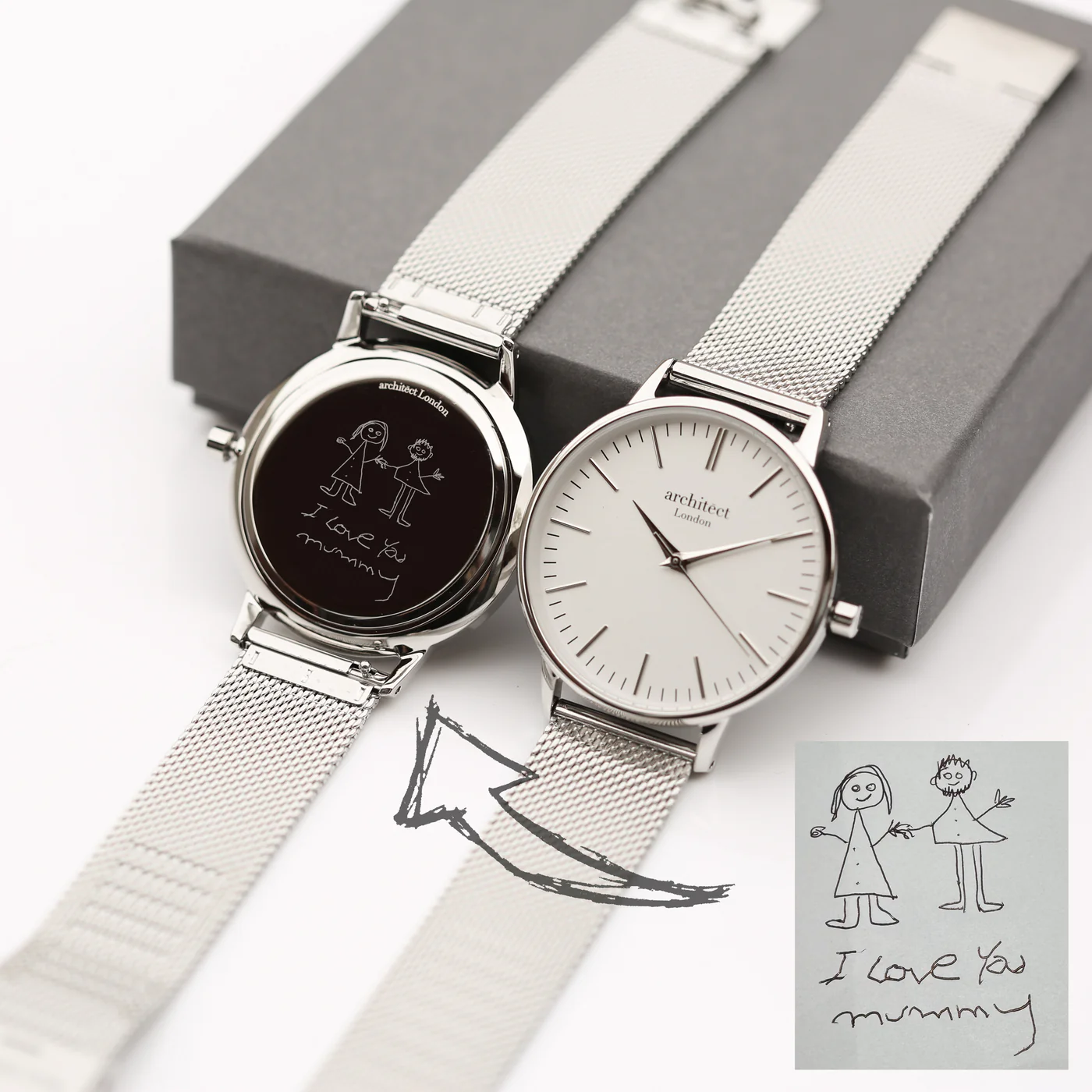 Crafted with a refined stainless steel case, a luxurious silver mesh strap, and a precise quartz movement, this watch is as reliable as it is visually stunning. What makes it even more special? The ability to personalise the back with your own actual handwriting, transformed into a premium engraving using Architect’s state-of-the-art technology.