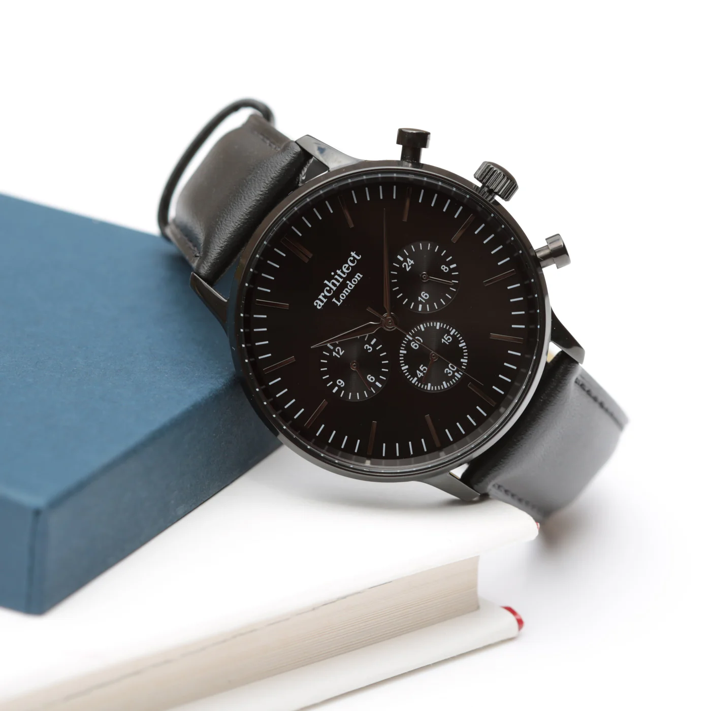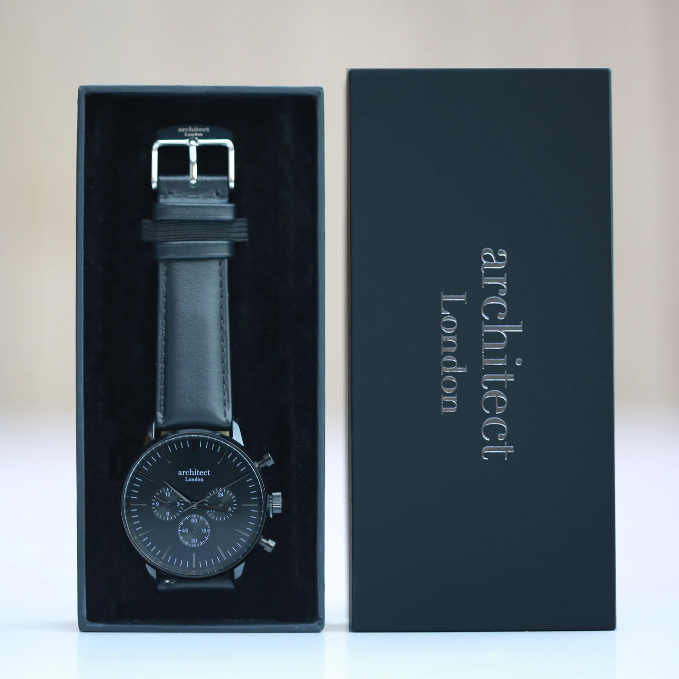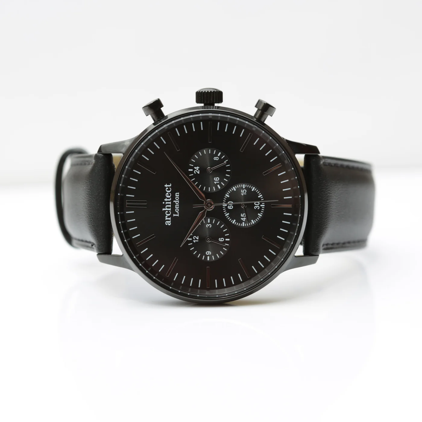 Timeless design meets personal meaning in the Architect London Motivator, a sophisticated black-face chronograph paired with a classic black genuine leather strap. Its bold minimalist aesthetic, combined with three fully operational chronograph subdials, makes this timepiece as functional as it is stylish. Designed for durability yet refined enough for daily wear, this watch effortlessly blends craftsmanship, comfort, and character.
