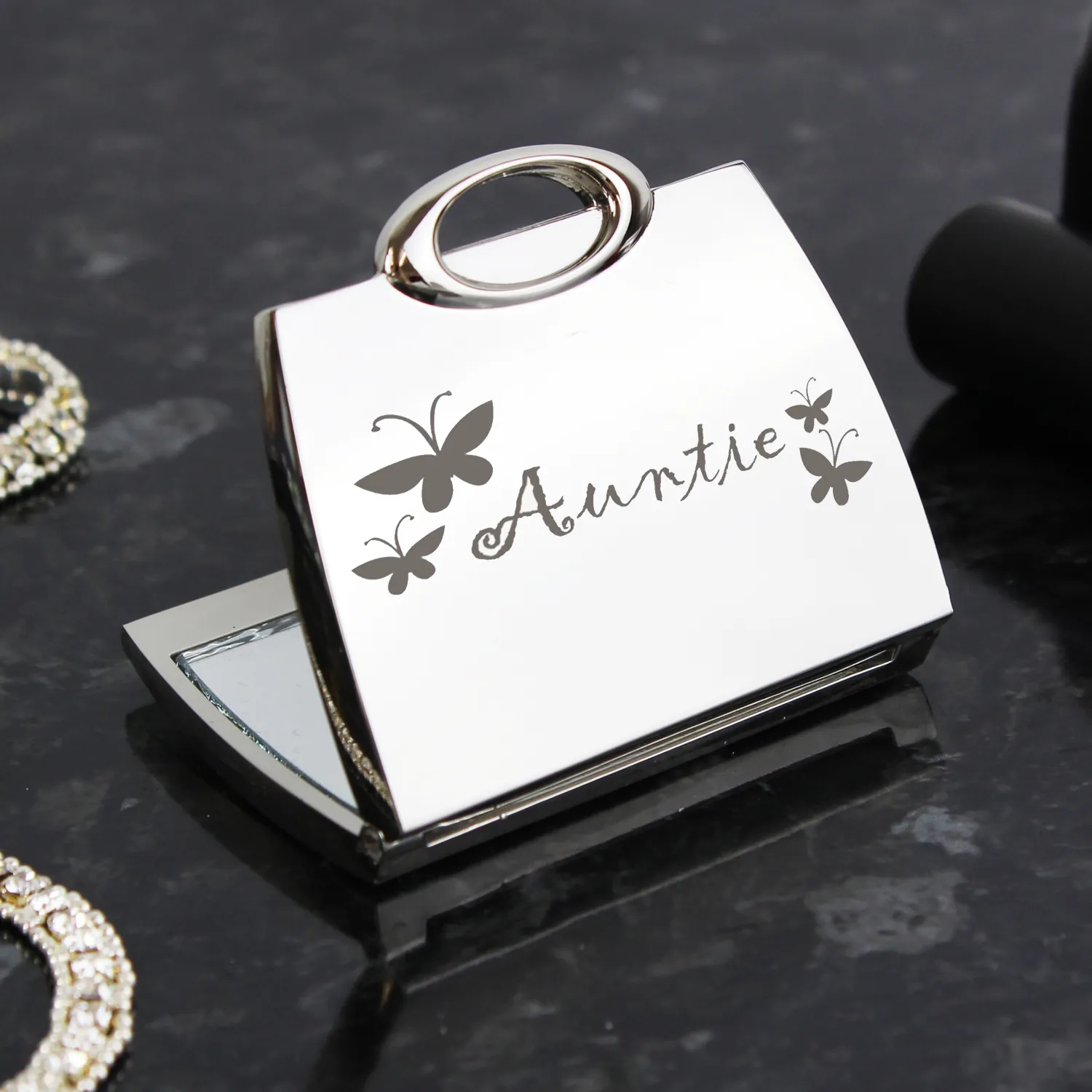 ‘Auntie’ Butterflies Motif Handbag Shaped Silver Nickel Plated Compact Mirror