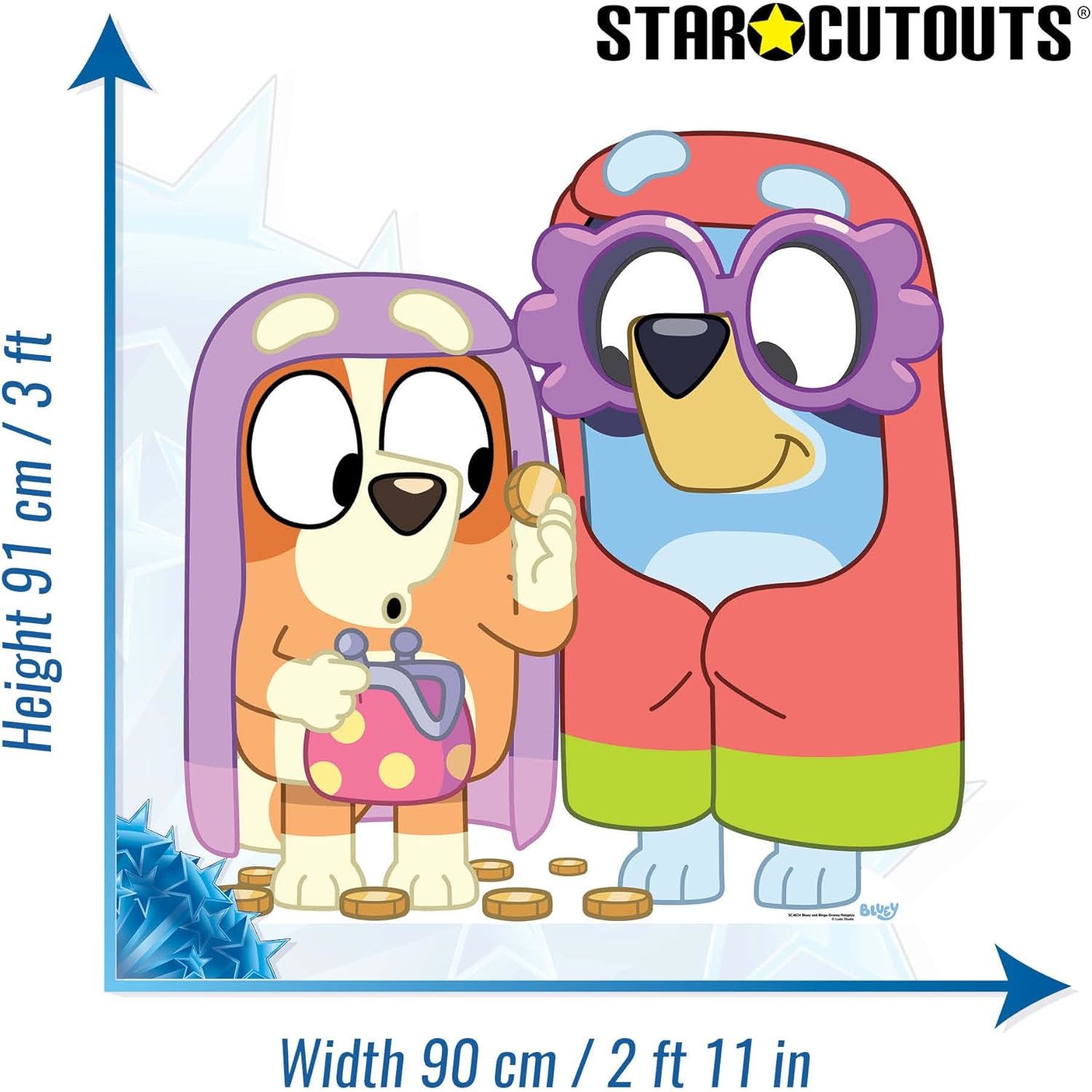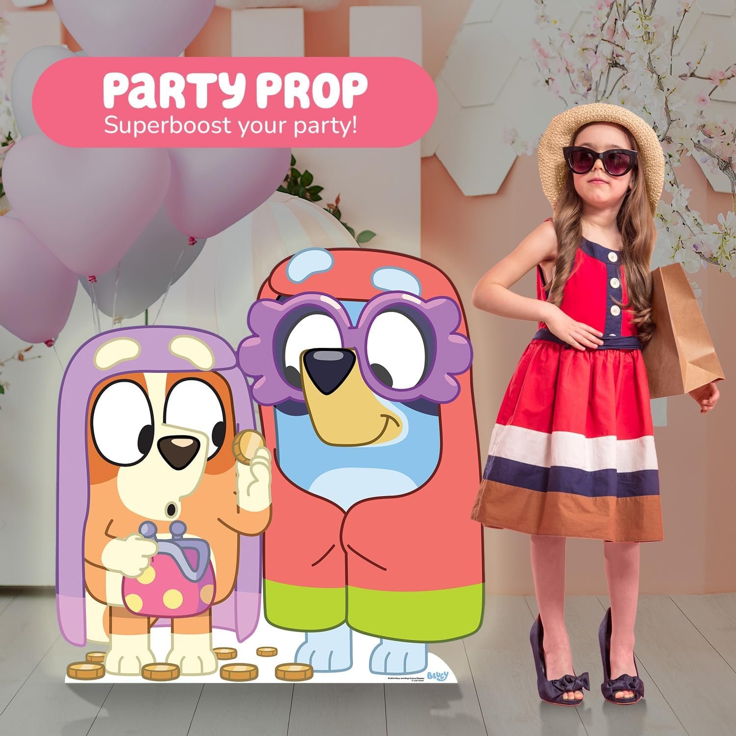Bring the charm of Bluey into your home with this delightful cardboard cutout featuring Bluey and Bingo dressed as adorable grannies! Perfect for fans of the beloved Australian animated series, this standee captures the playful spirit of the two lovable pups in their quirky granny disguises. With Bluey sporting a vibrant red and green outfit complete with oversized purple glasses, and Bingo rocking a purple shawl and polka-dot purse filled with coins, this cutout is a heart-warming nod to the show’s creative antics and laugh-out-loud moments.