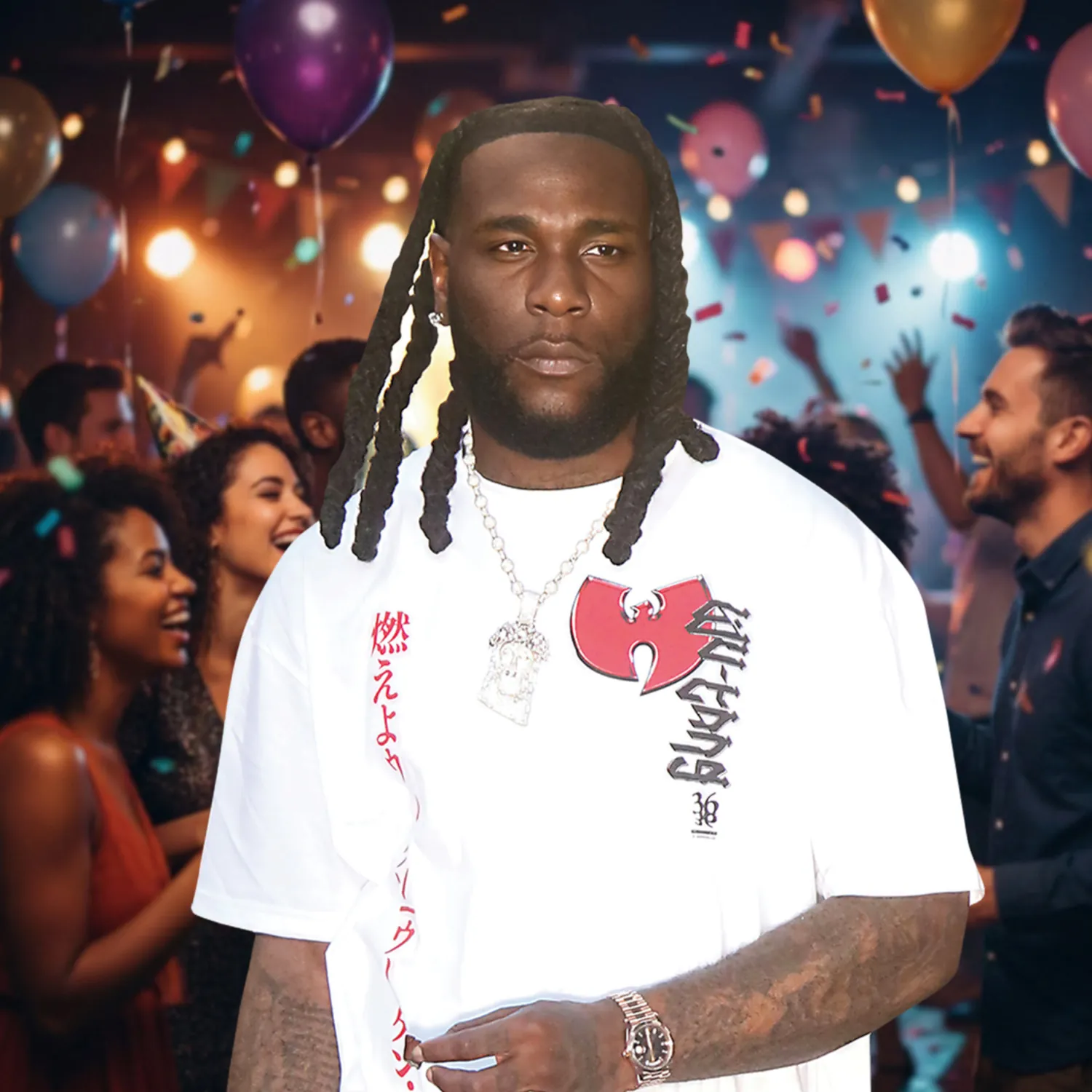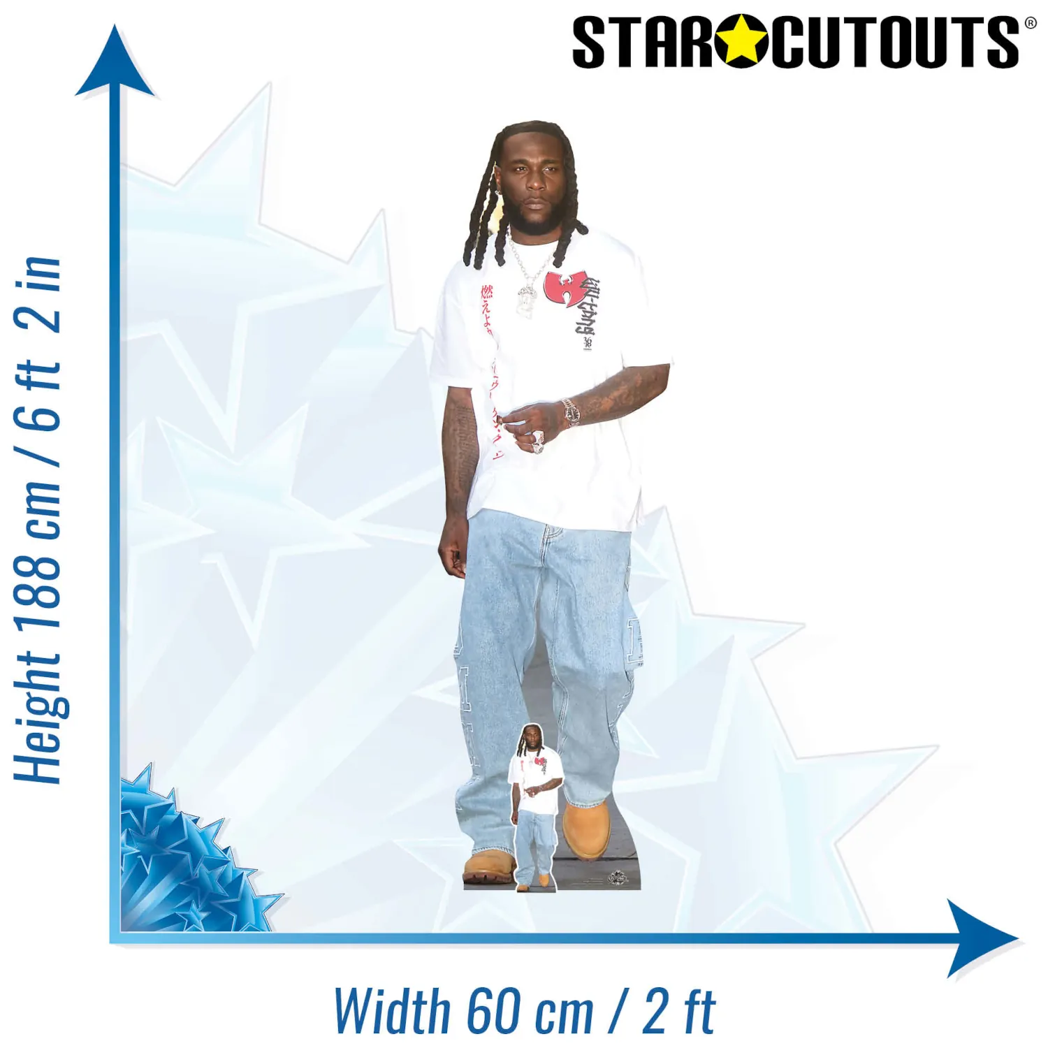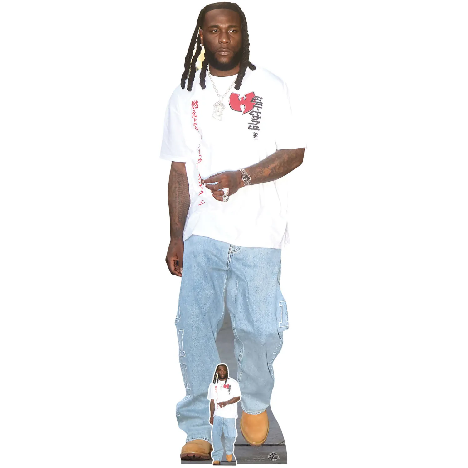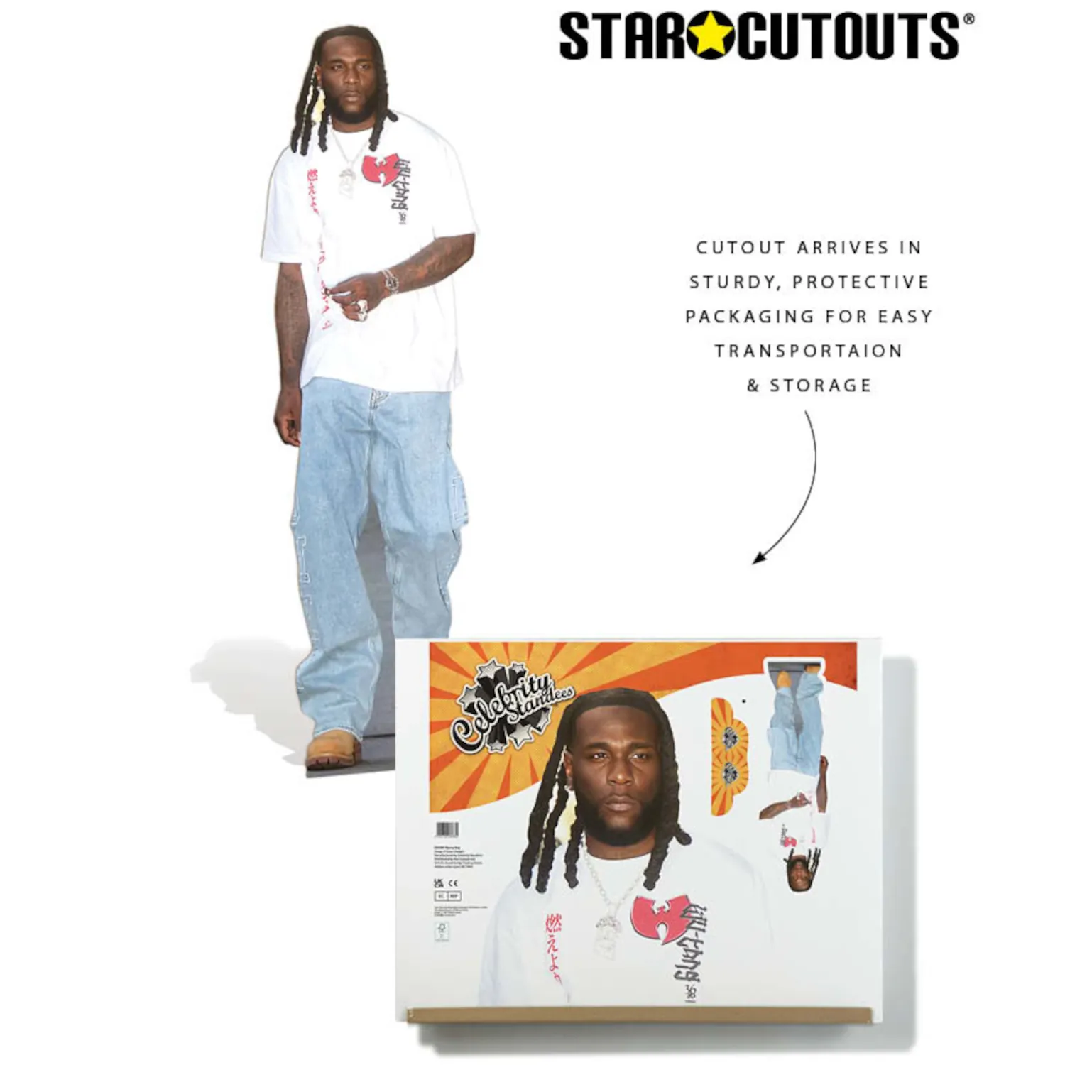 - Lifesize Celebrity Standee: Features global Afrofusion star Burna Boy in a stylish casual pose.