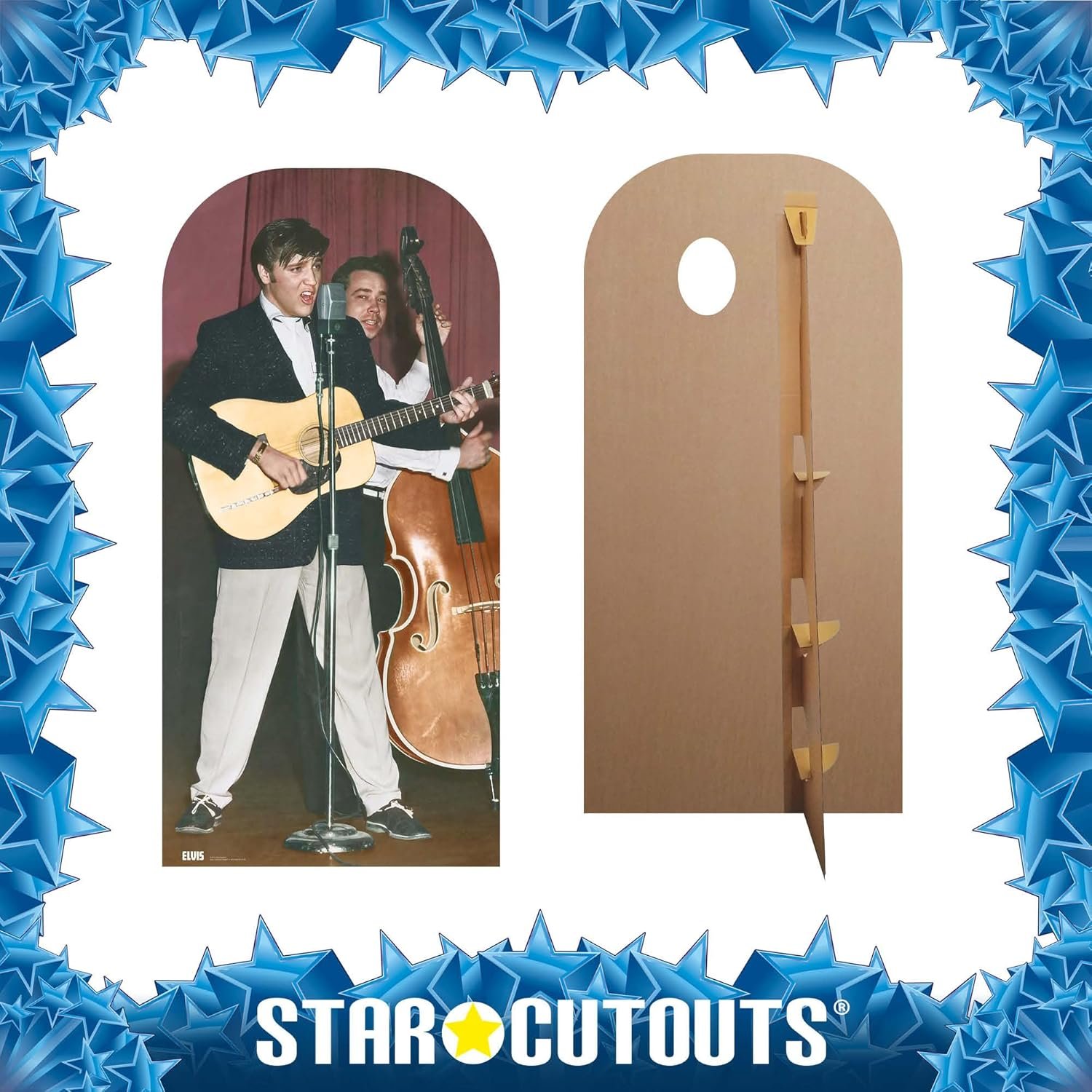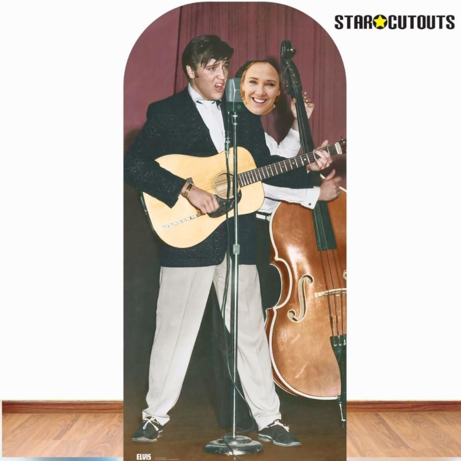 Step into rock ānā roll history with this fun and interactive Elvis Presley stand-in! Celebrating the early days of the King of Rock and Roll, this lifesize cardboard cutout lets you become part of Elvisās legendary band. Featuring a classic performance image of Elvis with his guitar, this stand-in includes a face hole where the double bass player would be ā so you can insert your face and steal the spotlight!