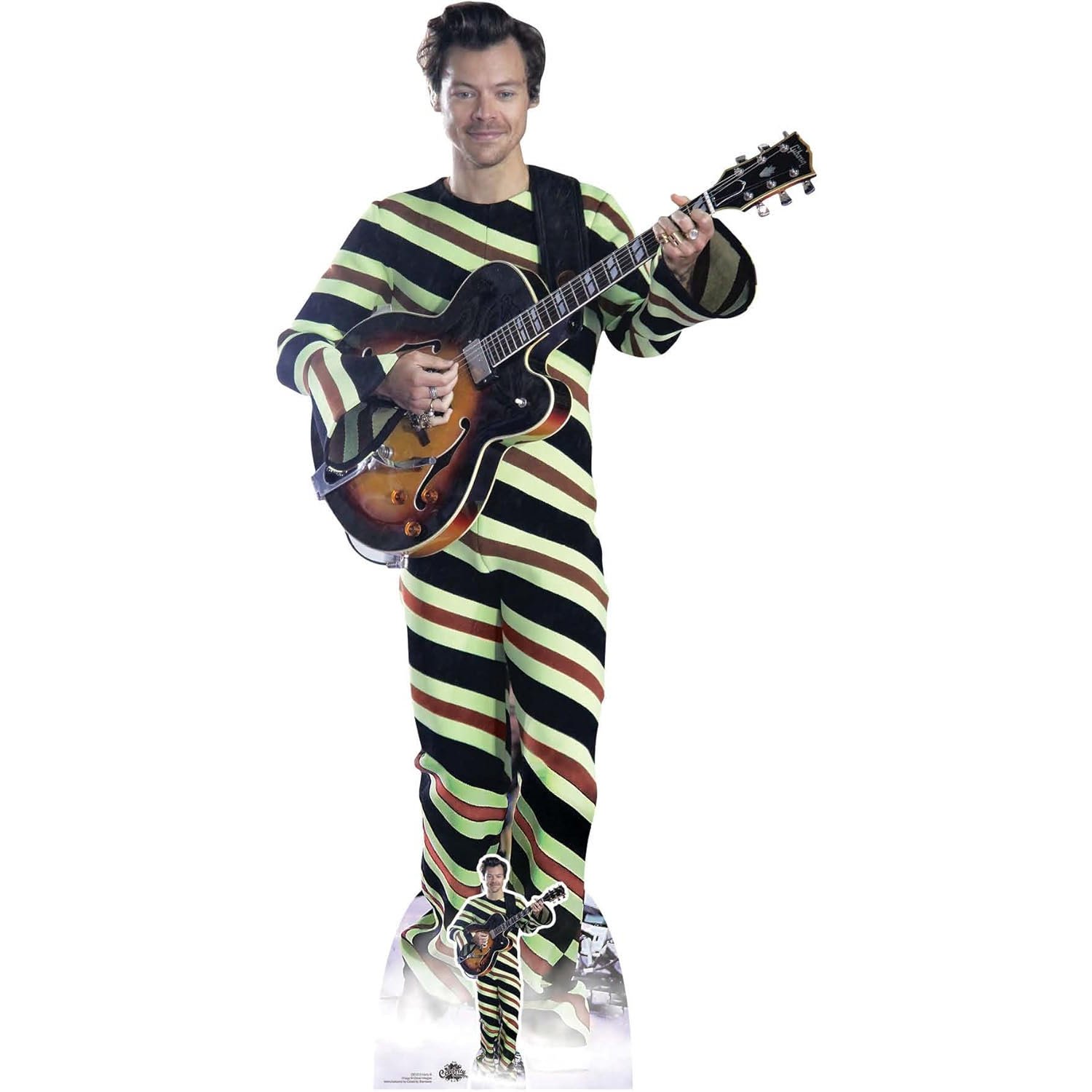 Bring the legendary style and musical charisma of Harry Styles into your space with this eye-catching cardboard cutout set. Featuring the English singer/songwriter in his iconic striped jumpsuit while holding a guitar, this set includes a lifesize standee and a mini tabletop cutout, perfect for fans, themed events, décor, and collector displays.