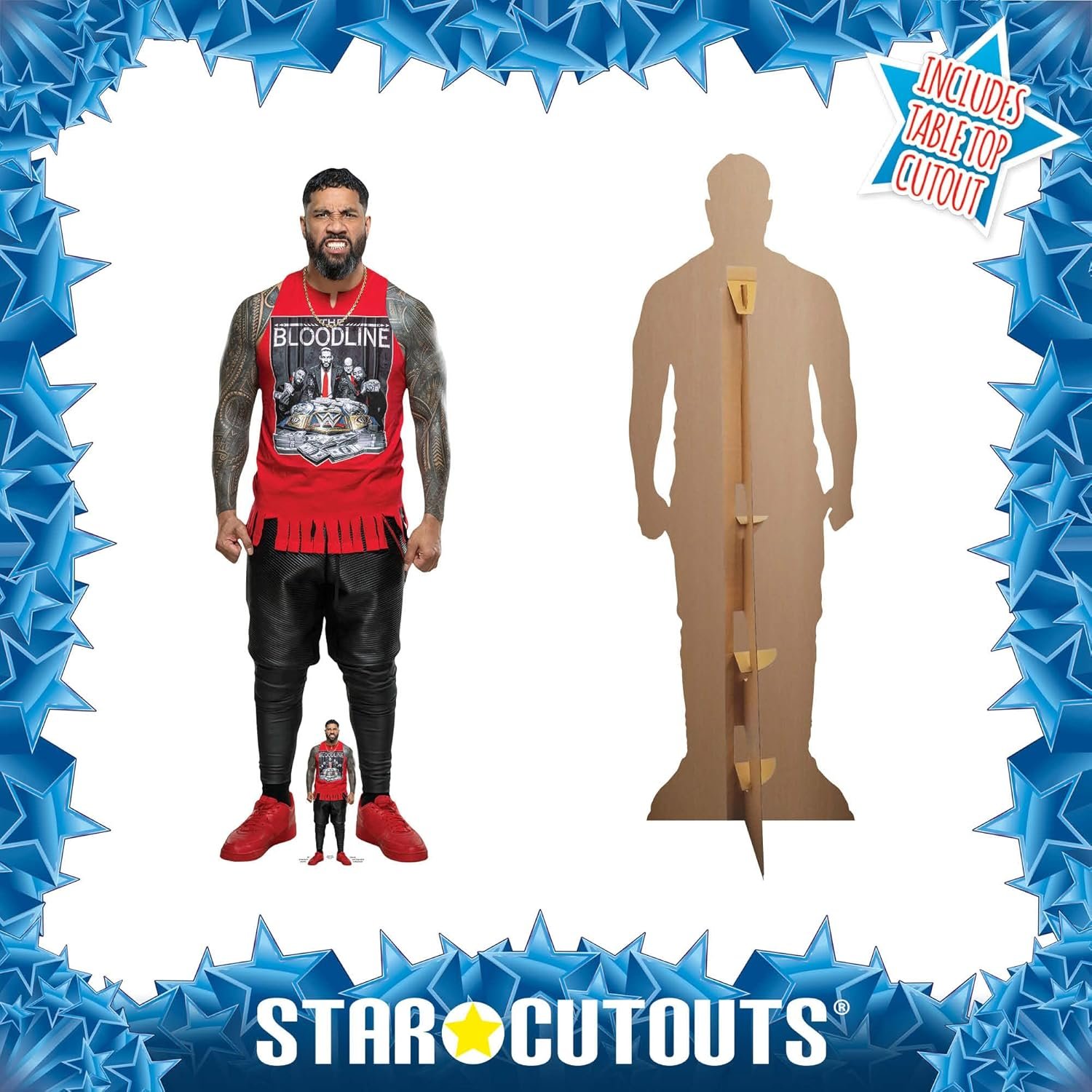 Bring the energy of “Main Event” Jey Uso straight into your space with this officially licensed WWE cardboard cutout set. Featuring one of the most charismatic and popular superstars of the modern era, this lifesize and mini standee captures Jey Uso’s iconic look and undeniable presence as part of the legendary tag team The Usos and a key figure in WWE’s Bloodline storyline.