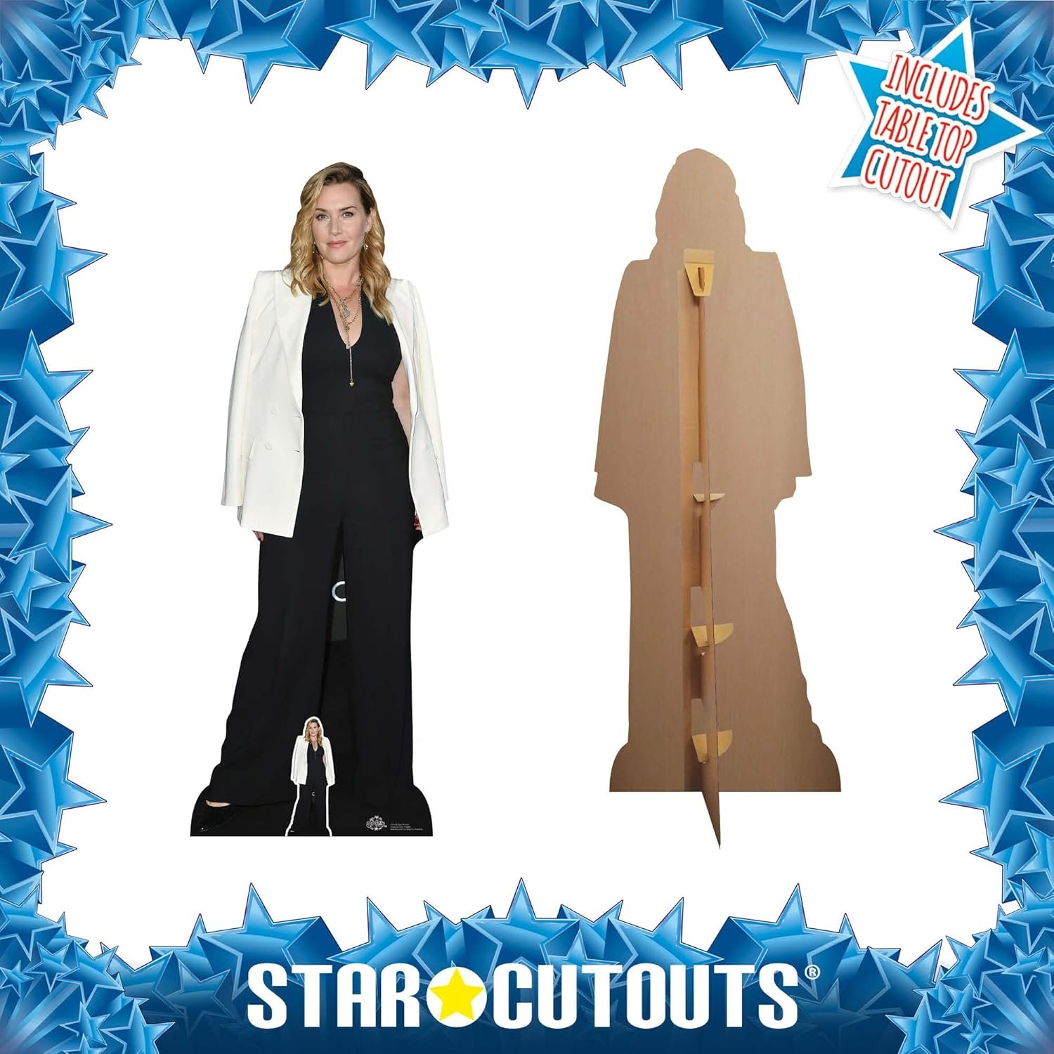 Celebrate the timeless elegance and award-winning talent of Kate Winslet with this beautifully crafted cardboard cutout set. Featuring a detailed lifesize standee along with a coordinating mini tabletop cutout, this set is perfect for film lovers, collectors, themed events, or anyone looking to add a touch of Hollywood prestige to their décor.