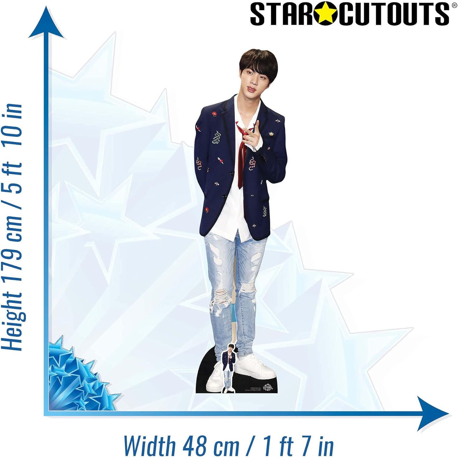 Bring the worldwide charm of Jin, BTS’s beloved vocalist, into your space with this stunning lifesize cardboard cutout and matching mini version. Perfect for fans who adore his warm vocals, signature visuals, and playful personality, this collectable standee is an essential addition to any BTS display.