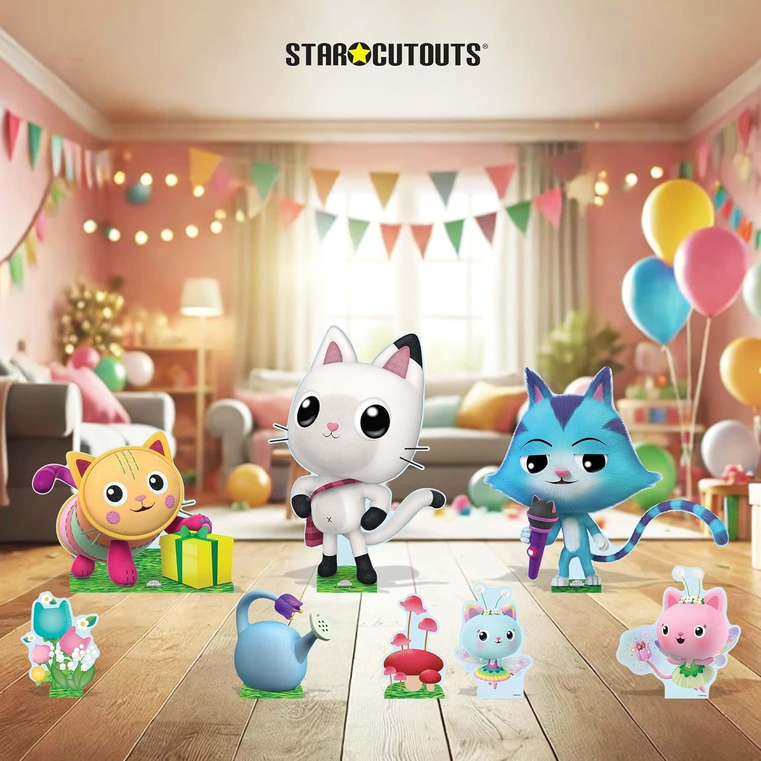 From Pandy Paws’ cuddly sweetness to CatRat’s cheeky antics and Pillow Cat’s dreamy calm, these vibrant standees capture everything kids love about Gabby’s Dollhouse. With a mix of character cutouts and themed tabletop decorations, this pack lets you build your own playful Dollhouse scene for parties, playrooms, or displays.