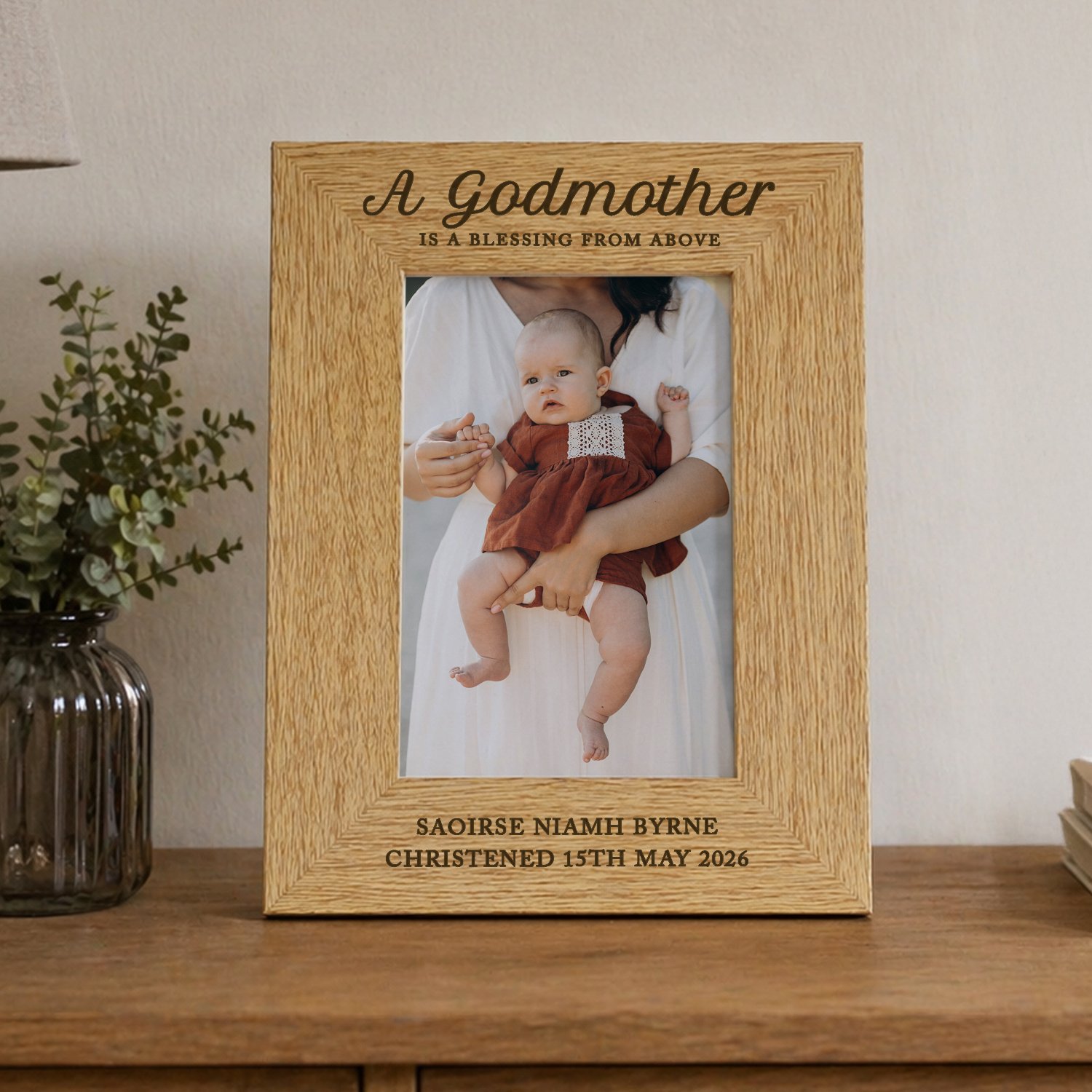 Show your appreciation with the Personalised “A Godmother Is A Blessing From Above” 4×6 Portrait Oak Finish Photo Frame, a heartfelt keepsake perfect for celebrating a special bond. With its warm oak veneer finish and meaningful message, this elegant frame makes a thoughtful thank you gift for a cherished godmother.
