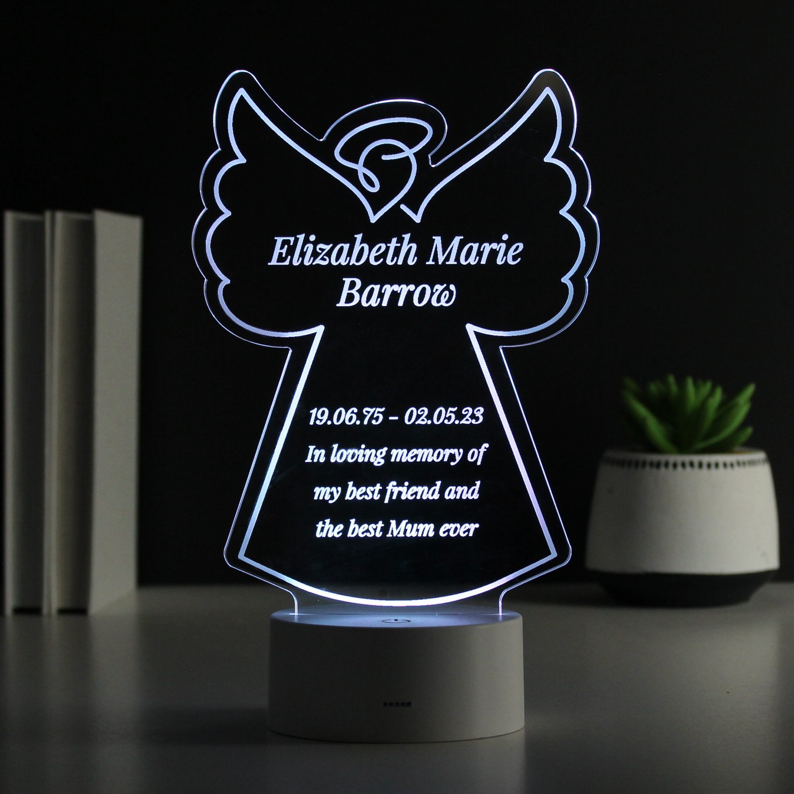 Create a heartfelt keepsake to honour the memory of someone special with this beautifully crafted angel-shaped LED light. Fully customisable, this light allows you to add your own words, making it a truly personal and meaningful tribute.