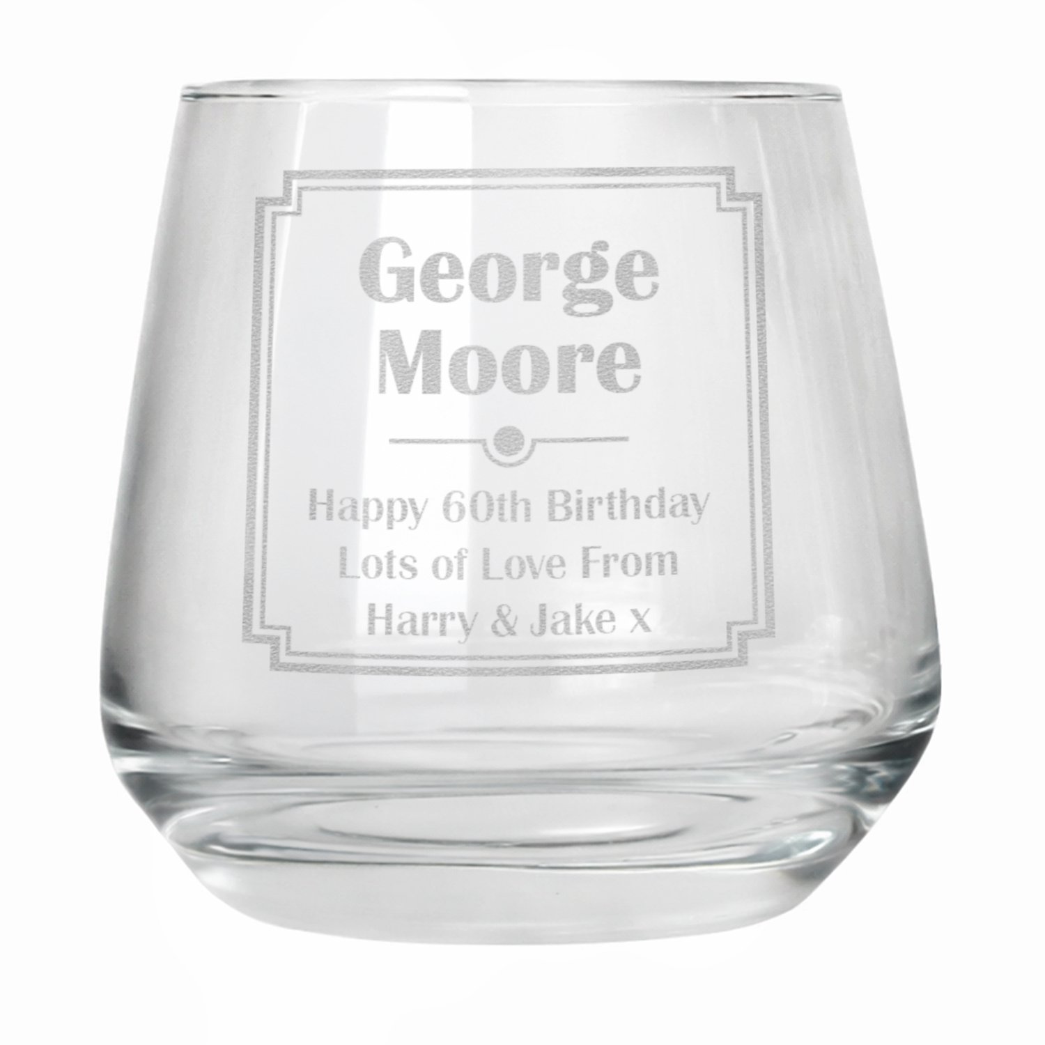 Add a touch of vintage glamour to any drinks cabinet with this stunning personalised Art Deco glass tumbler. Featuring a timeless geometric design inspired by the elegance of the 1920s, this stylish whisky glass can be customised with your own message, making it a truly unique and thoughtful gift for any occasion.