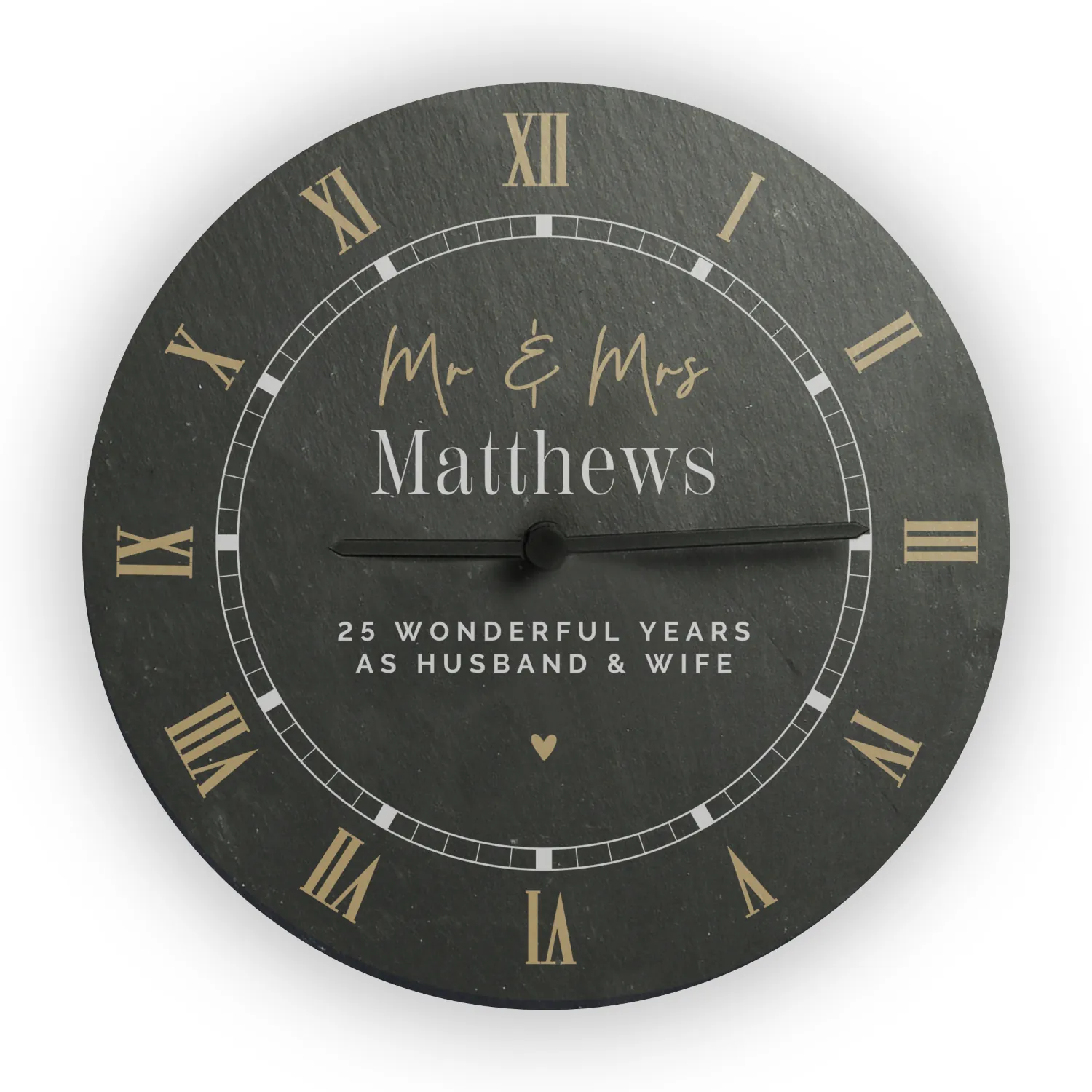 Add a touch of rustic elegance to any home with this Personalised Black & Gold Round Slate Wall Clock. Perfect as a thoughtful gift for a new home or a wedding, this stylish slate clock combines practicality with bespoke personalisation, making it a keepsake to treasure for years to come.