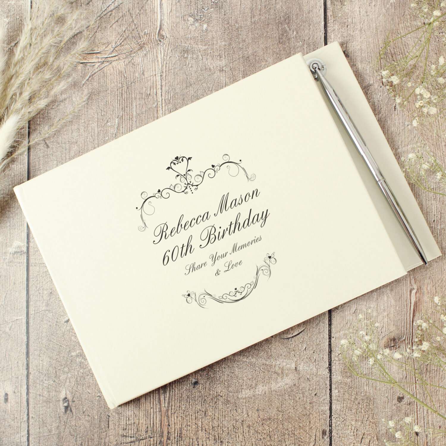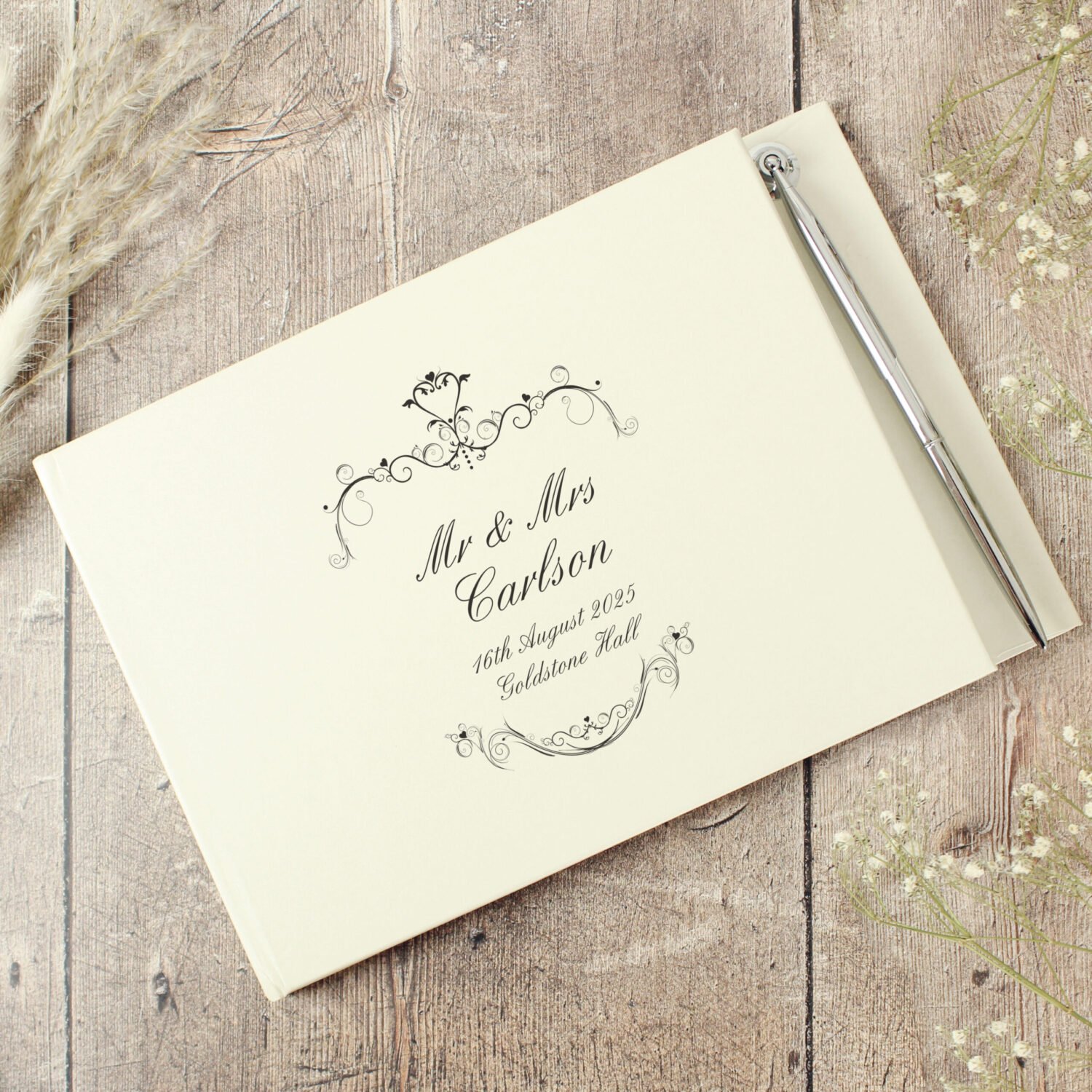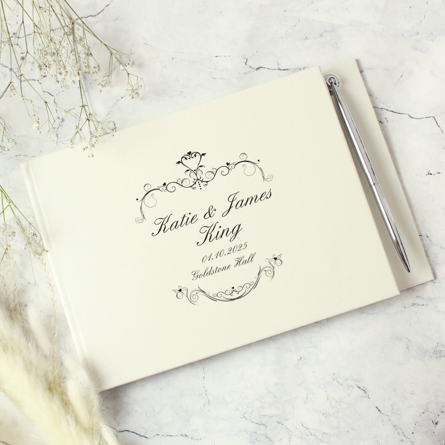 Add a touch of elegance to any special occasion with this Personalised Black Ornate Swirl Guest Book & Pen Set. Featuring a luxurious black swirl design on the cover, this guest book is ideal for weddings, anniversaries, or milestone celebrations — offering guests a beautiful space to leave heartfelt messages.