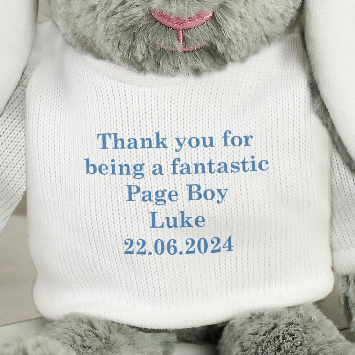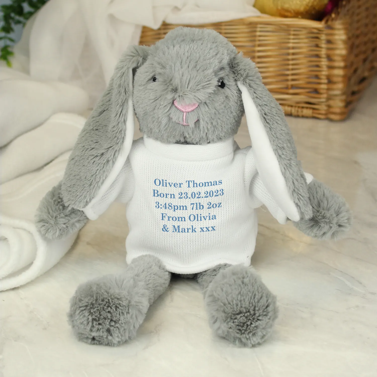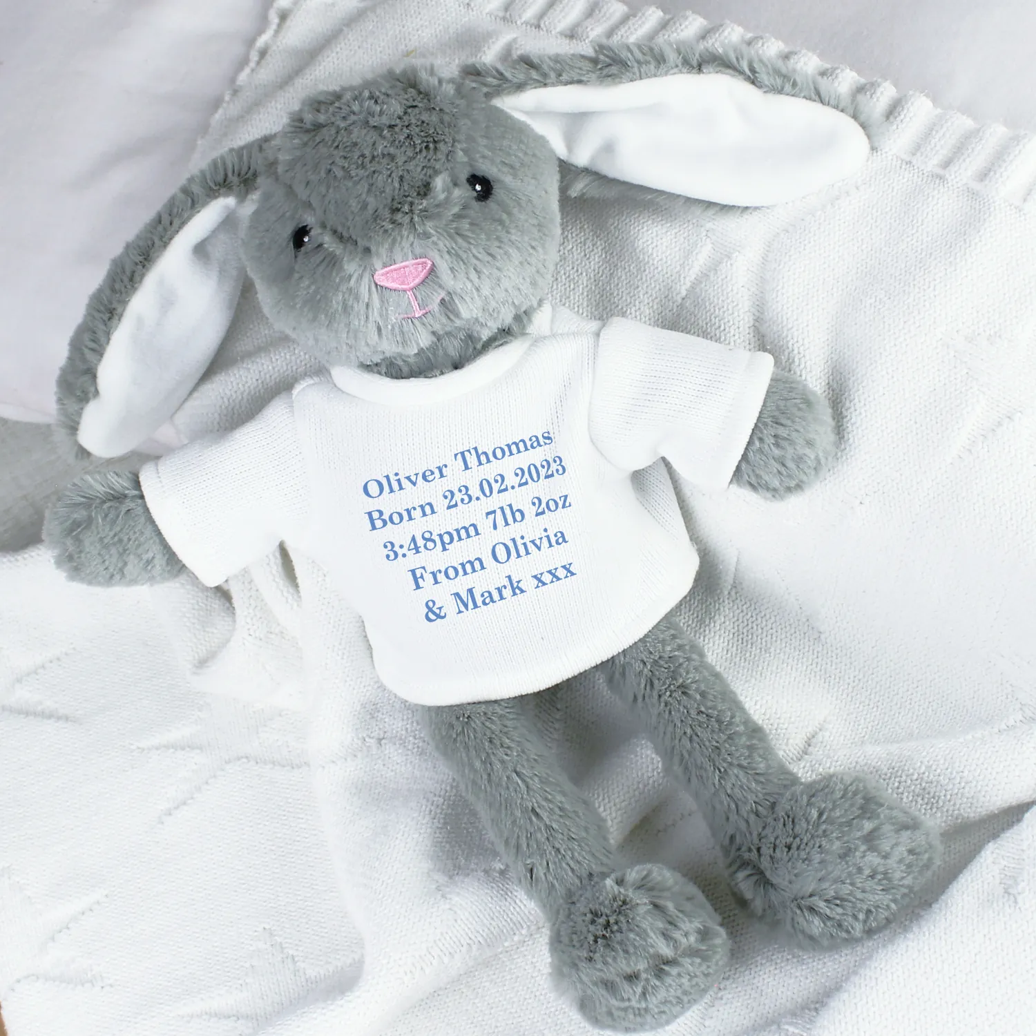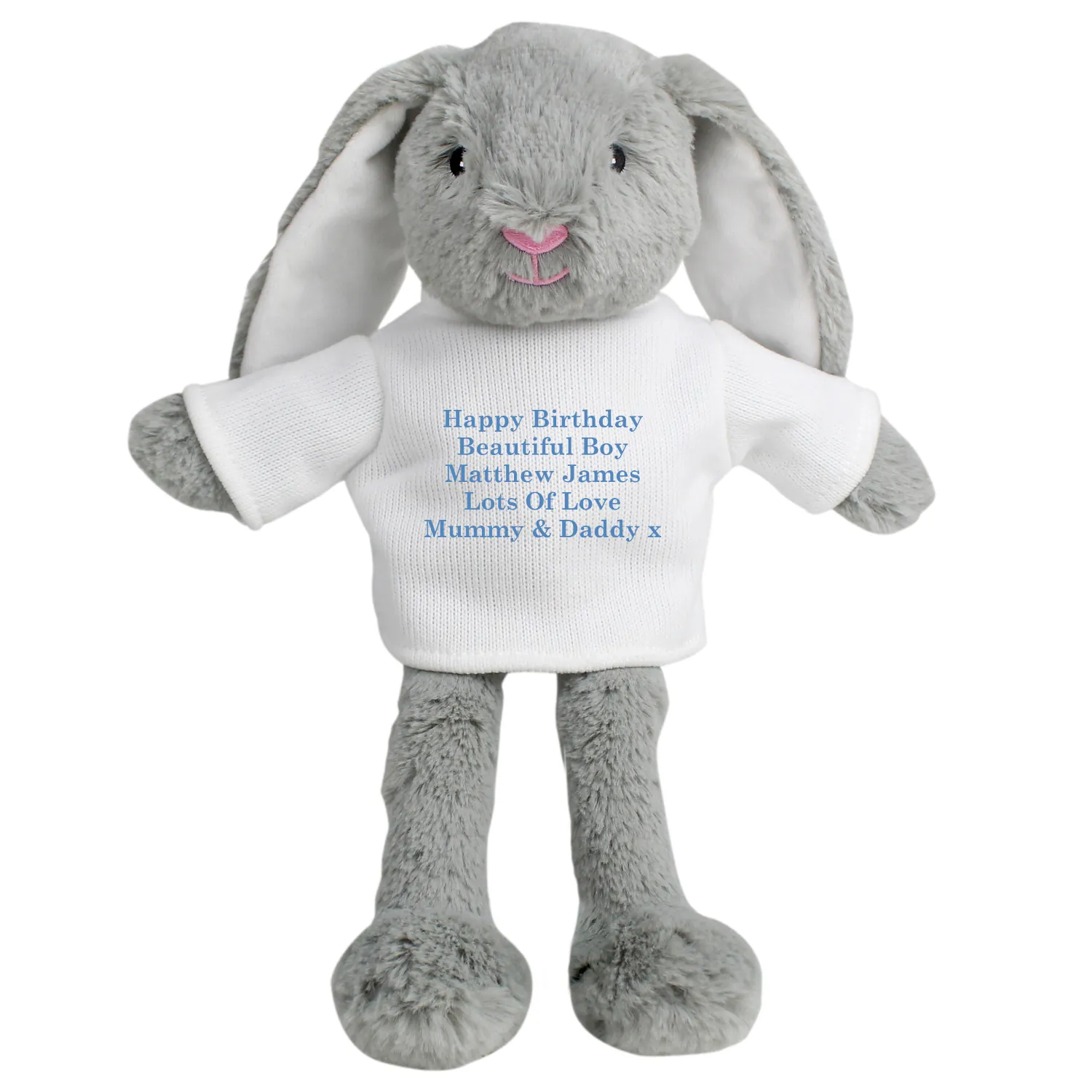 • Soft Blue Design with Personalised Text: Your message is printed in a stylish blue font, making this bunny a one-of-a-kind gift that’s truly unique.