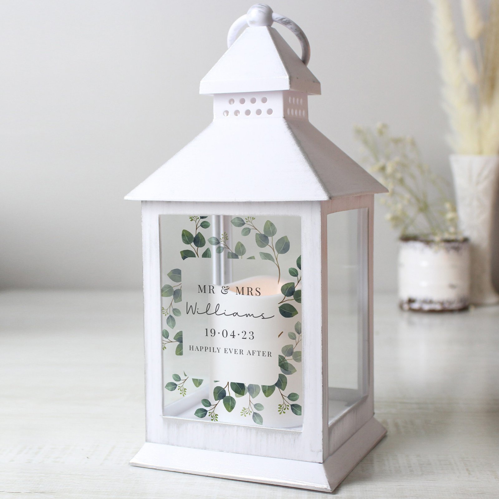 This Personalised Botanical Rustic White Lantern is both practical and decorative—a meaningful keepsake that brings a warm and inviting ambience to any home.