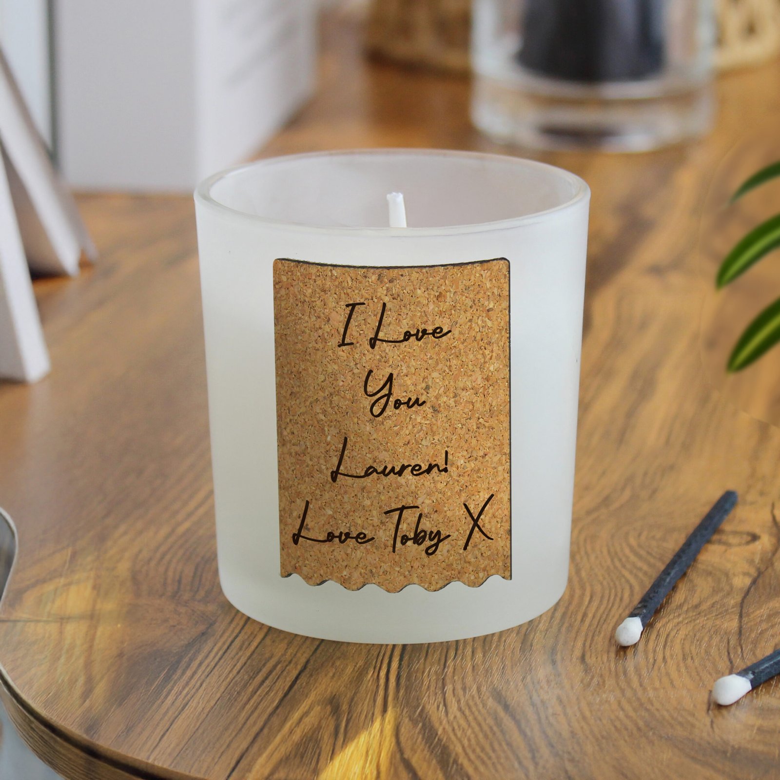 Personalised Any Message Cork Label Design Scented Frosted Glass Jar Candle