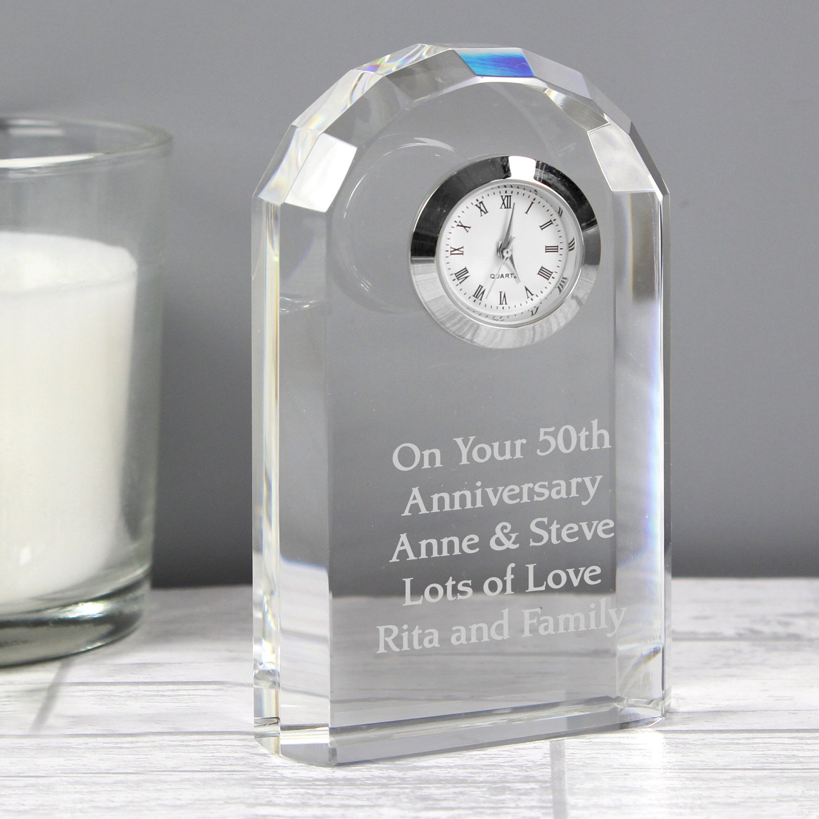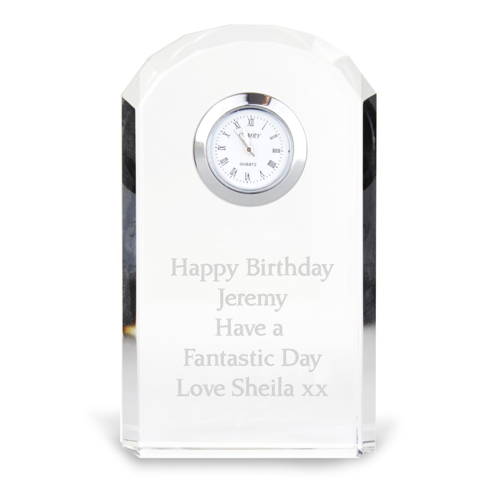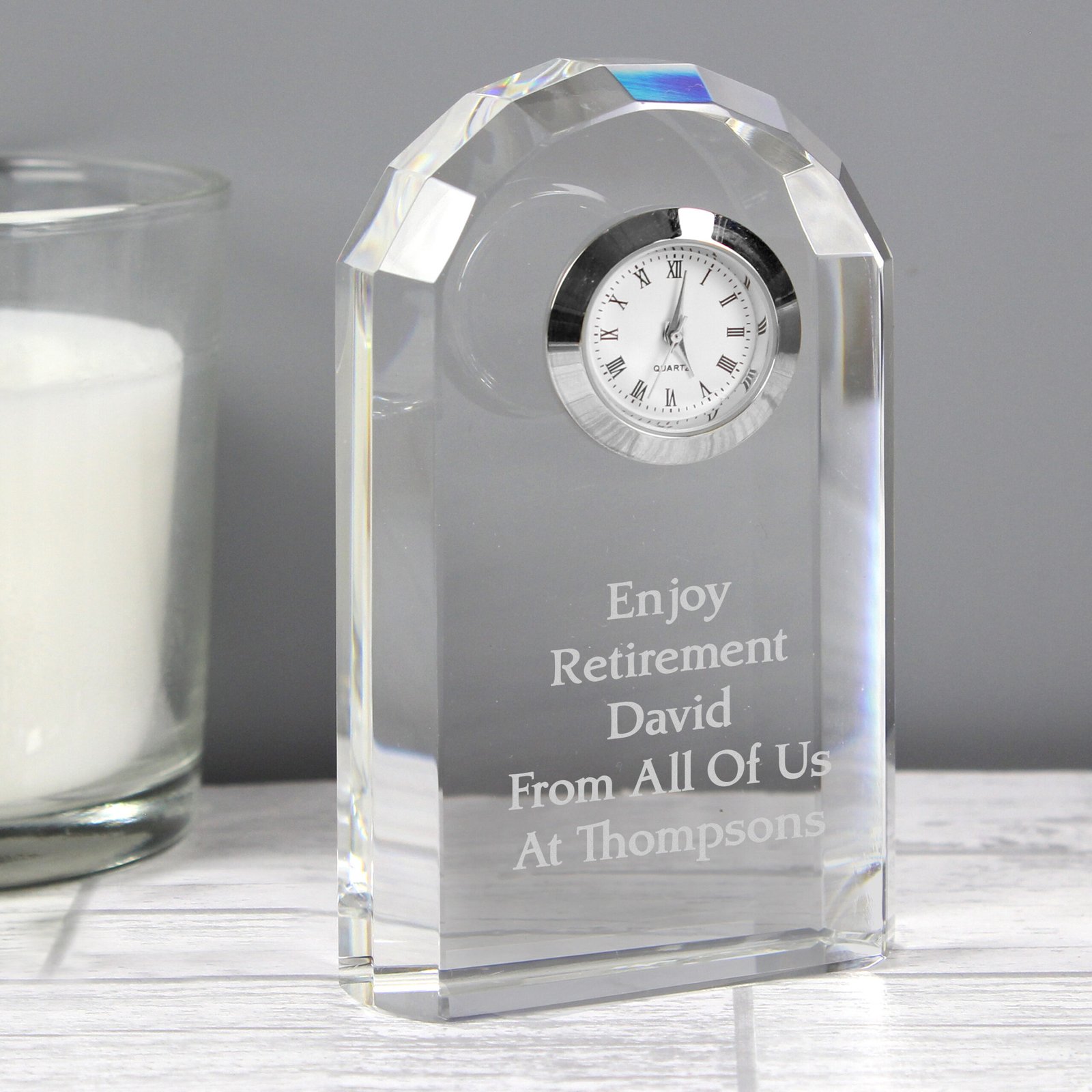 Timeless elegance meets personal sentiment with this stunning Personalised Crystal Mantel Clock. Crafted from beautifully clear crystal and featuring a classic clock face, this elegant timepiece makes a thoughtful and enduring gift for any special occasion.