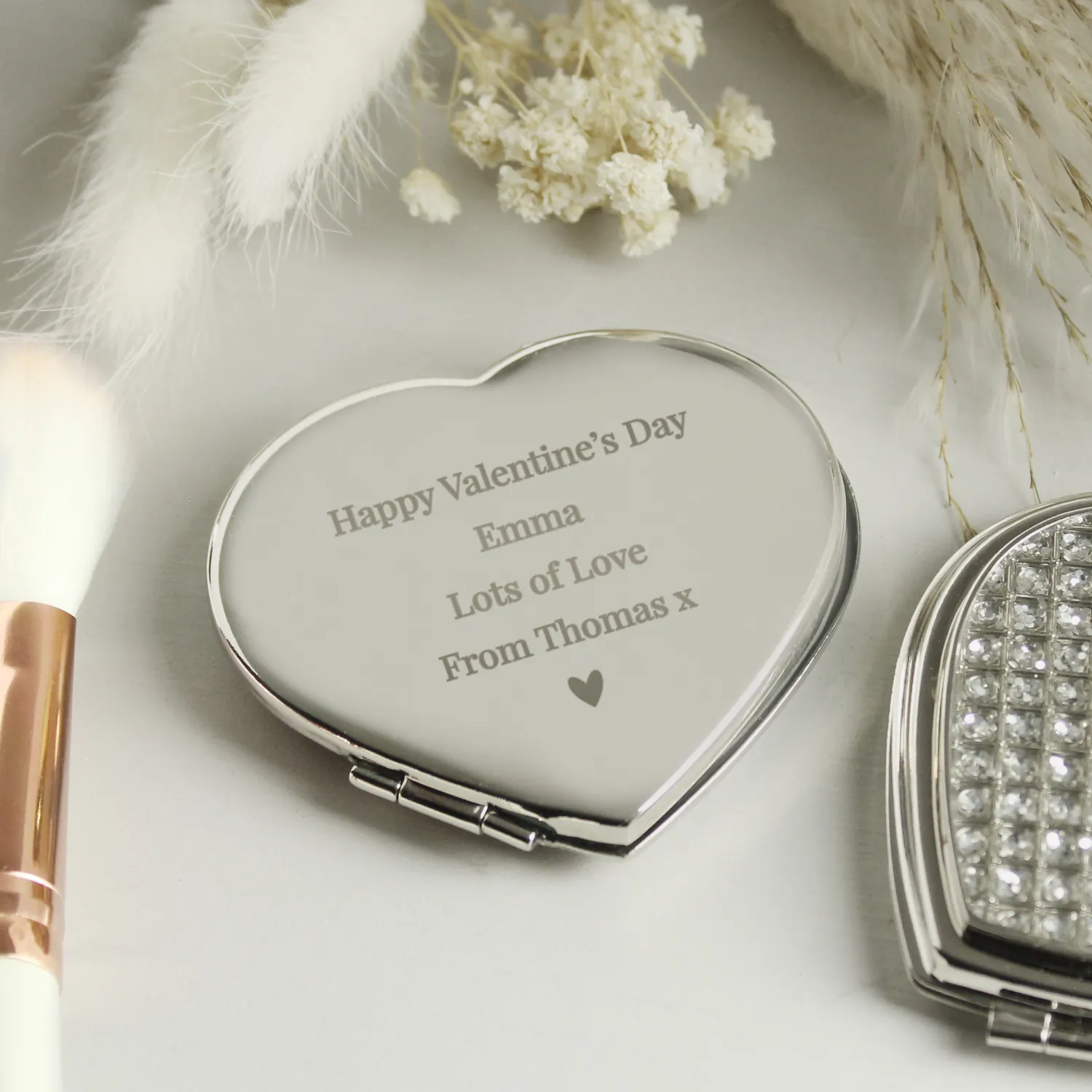 This elegant heart-shaped compact mirror features a sparkling diamante effect and is the perfect personalised gift for someone special. A stylish and practical accessory that fits effortlessly into any handbag.