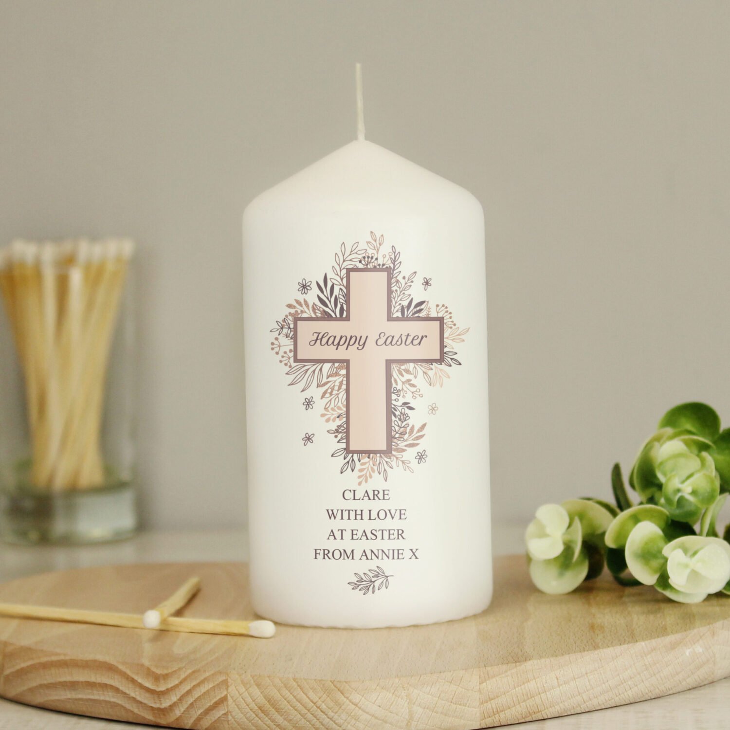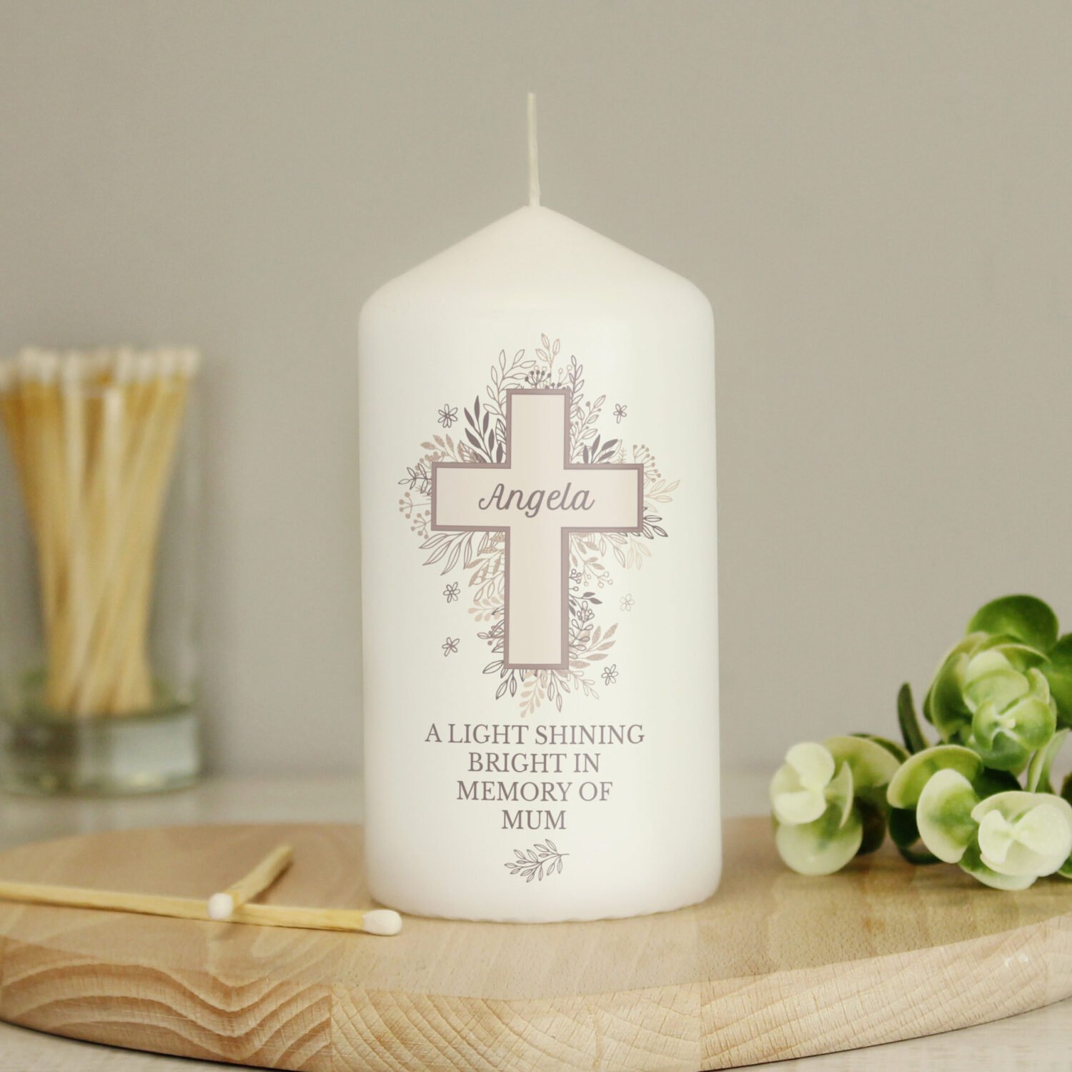 Create a touching tribute or celebrate a meaningful occasion with this elegant Personalised Floral Cross Design Pillar Candle. Featuring a beautiful floral cross design, this candle offers a heartfelt way to honour a loved one or mark a special religious moment.