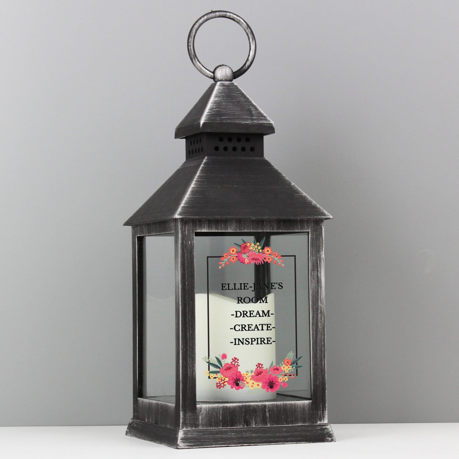 Brighten up any room with this charming Personalised Floral Design Rustic Black Light-up Lantern. Featuring a splash of floral colour and a warm flickering flame effect, this lantern combines rustic style with personal sentiment.