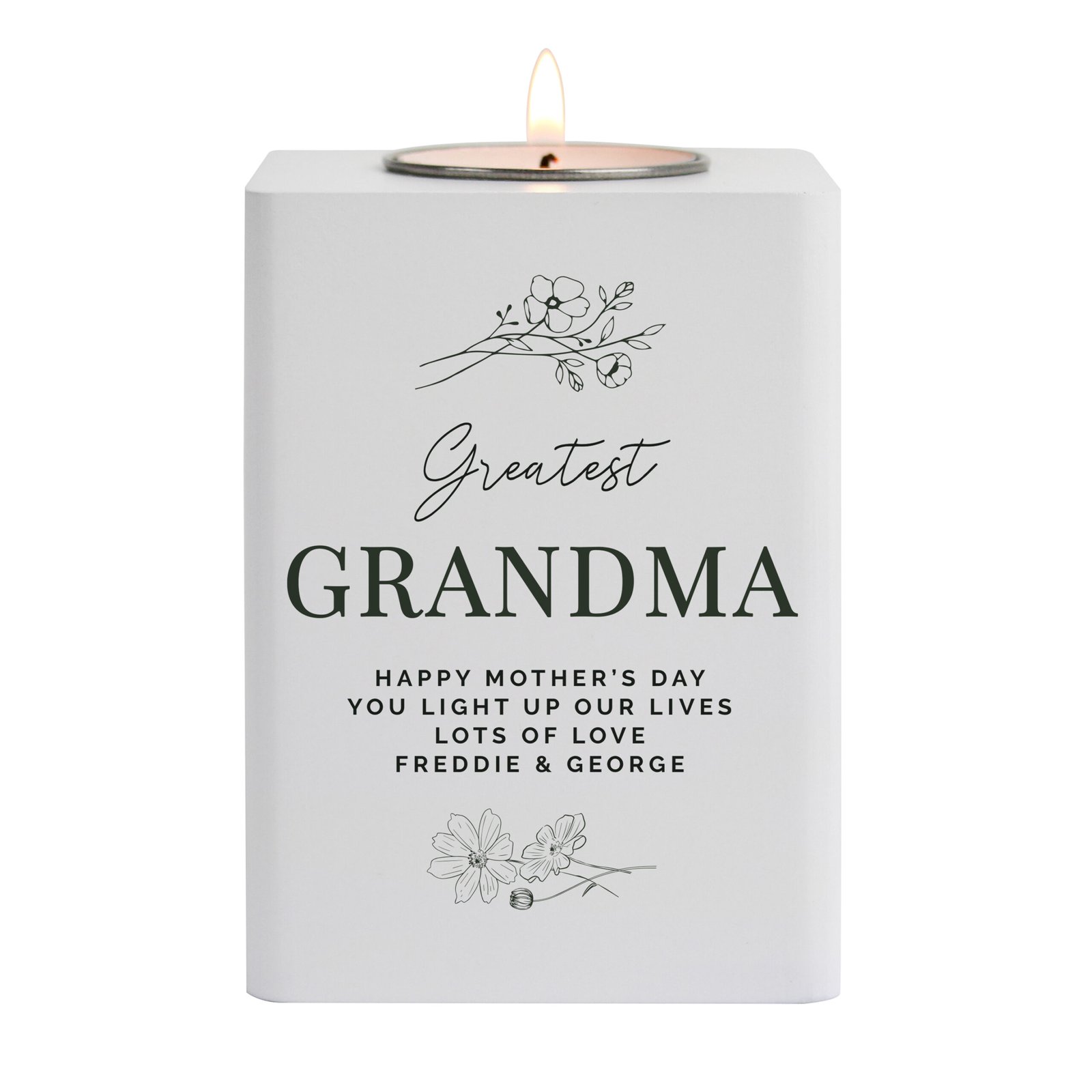 Create a warm and thoughtful atmosphere with this Personalised Floral Design White Wooden Tea Light Holder. A beautiful keepsake that’s both decorative and practical, this candle holder makes a perfect gift for Mother’s Day, birthdays, or simply to show someone how much they mean to you.