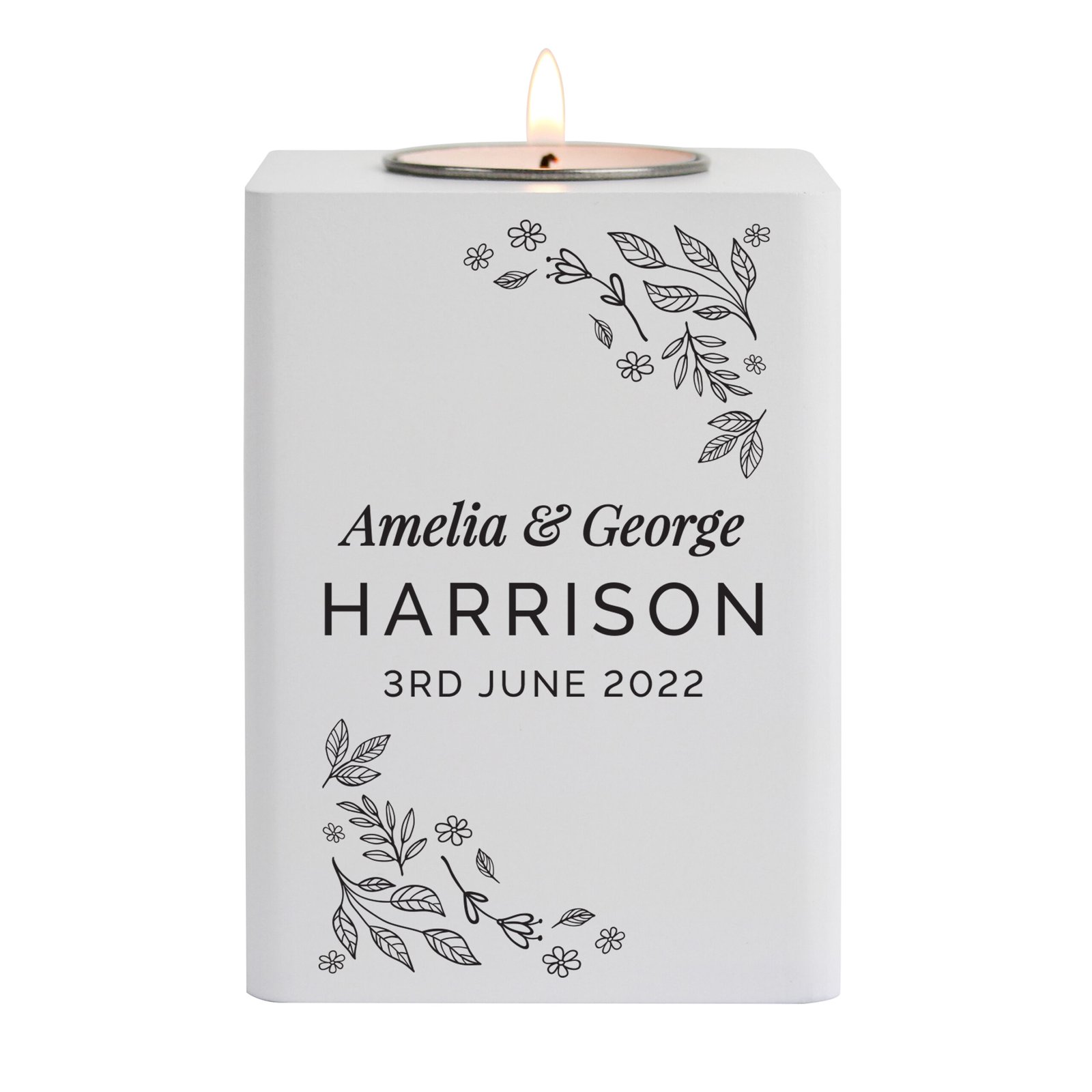 Personalised Any Message Floral Leaf Design White Wooden Tea Light Candle Holder