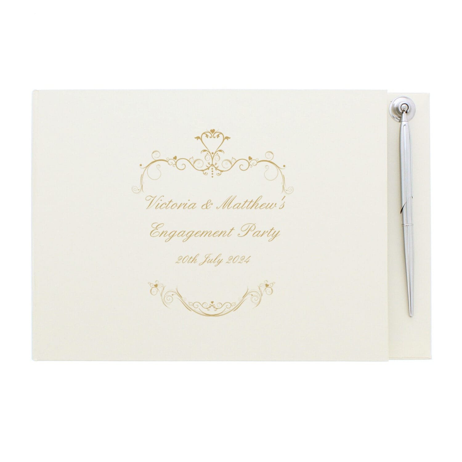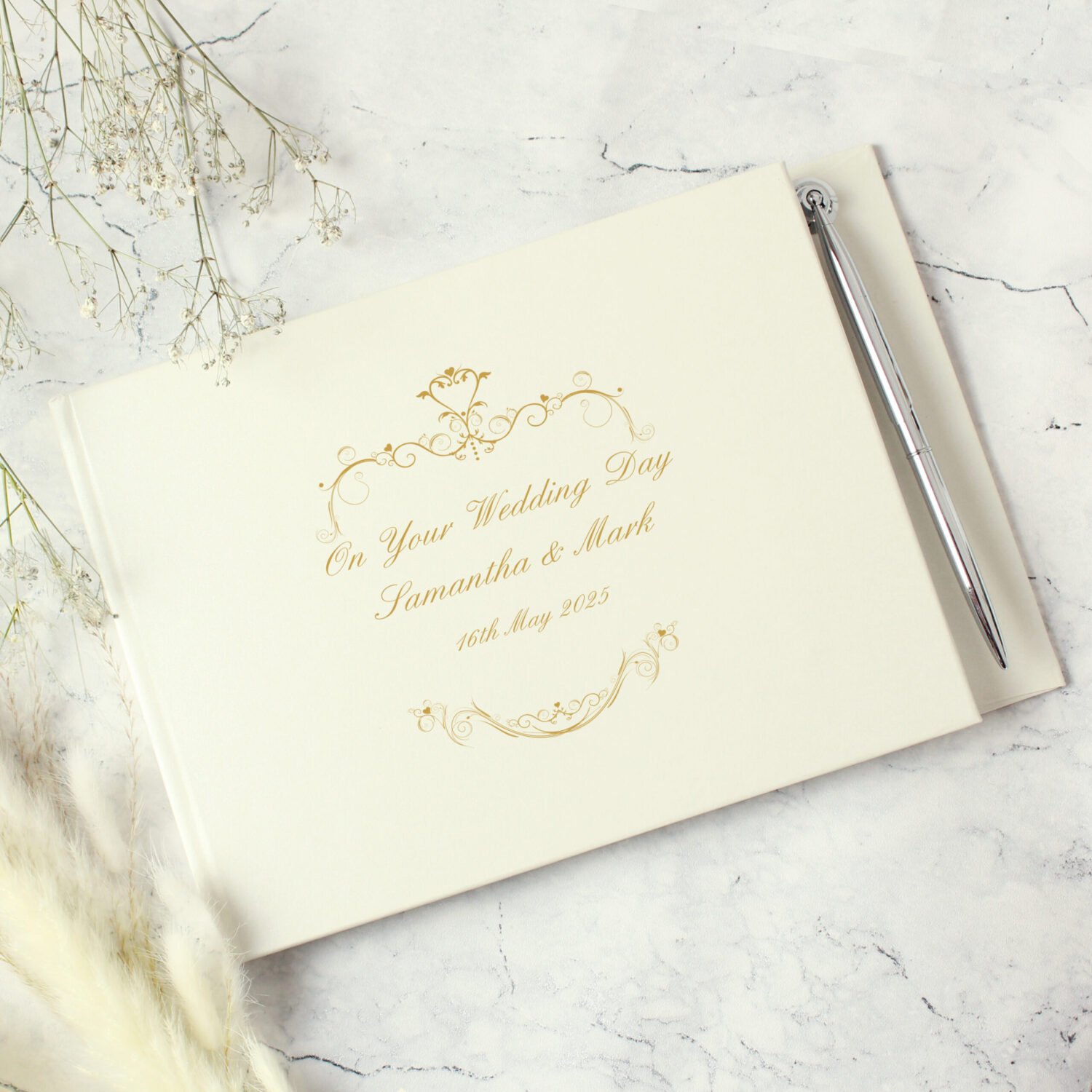 Personalised Any Message Gold Ornate Swirl Design Hardback Guest Book & Pen