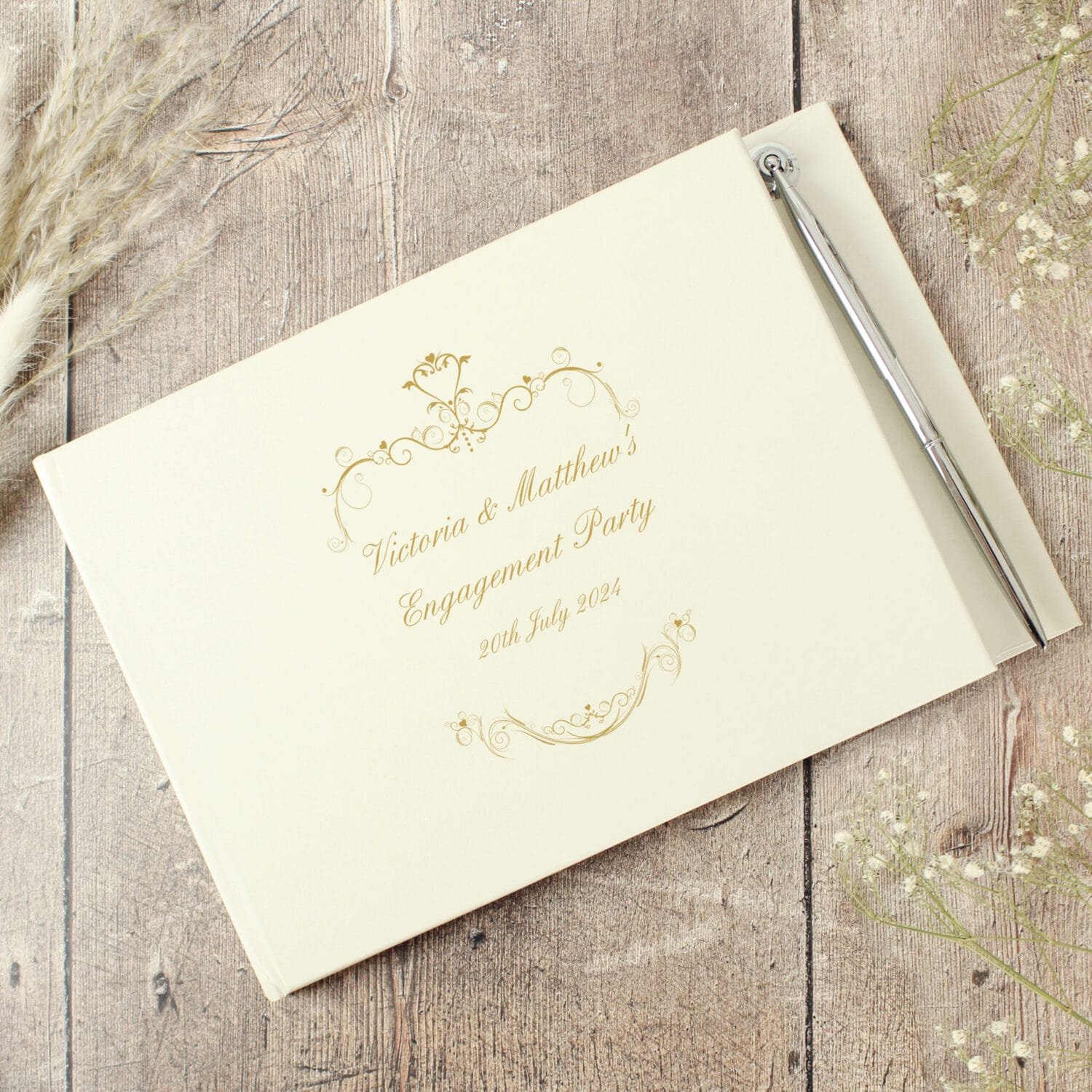 Add a touch of elegance to any special occasion with this Personalised Gold Ornate Swirl Guest Book & Pen Set. Featuring a luxurious gold swirl design on the cover, this guest book is ideal for weddings, anniversaries, or milestone celebrations — offering guests a beautiful space to leave heartfelt messages.