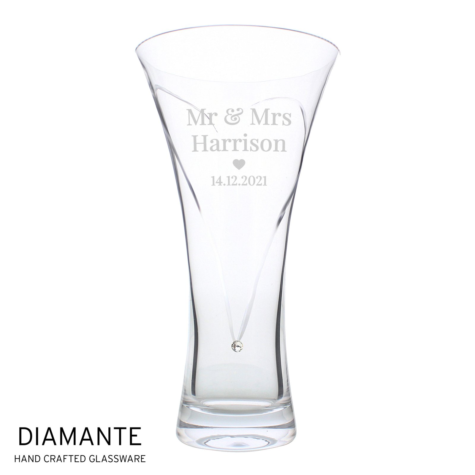 Celebrate a special occasion with this stunning hand-cut diamante heart glass vase, personalised to create a truly unique keepsake. Perfect for weddings, anniversaries, or as a heartfelt gift.