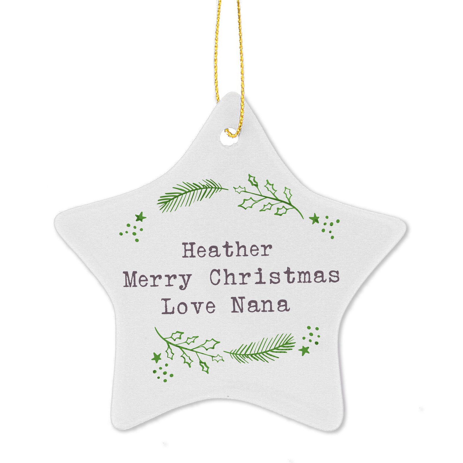 Personalised Any Message Holly Design Ceramic Star Shaped Christmas Decoration