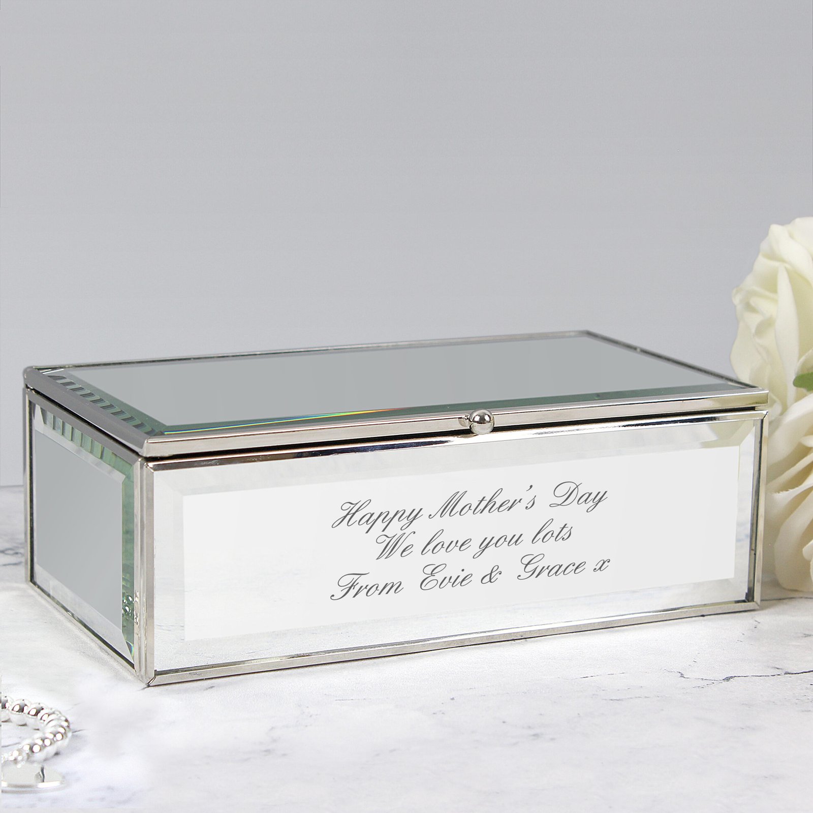 Elegant, contemporary, and completely personal — this Personalised Mirrored Glass Jewellery Box is a stunning way to store your treasured pieces. With its sleek mirrored finish and personalised touch, it makes a stylish and meaningful gift for any occasion.