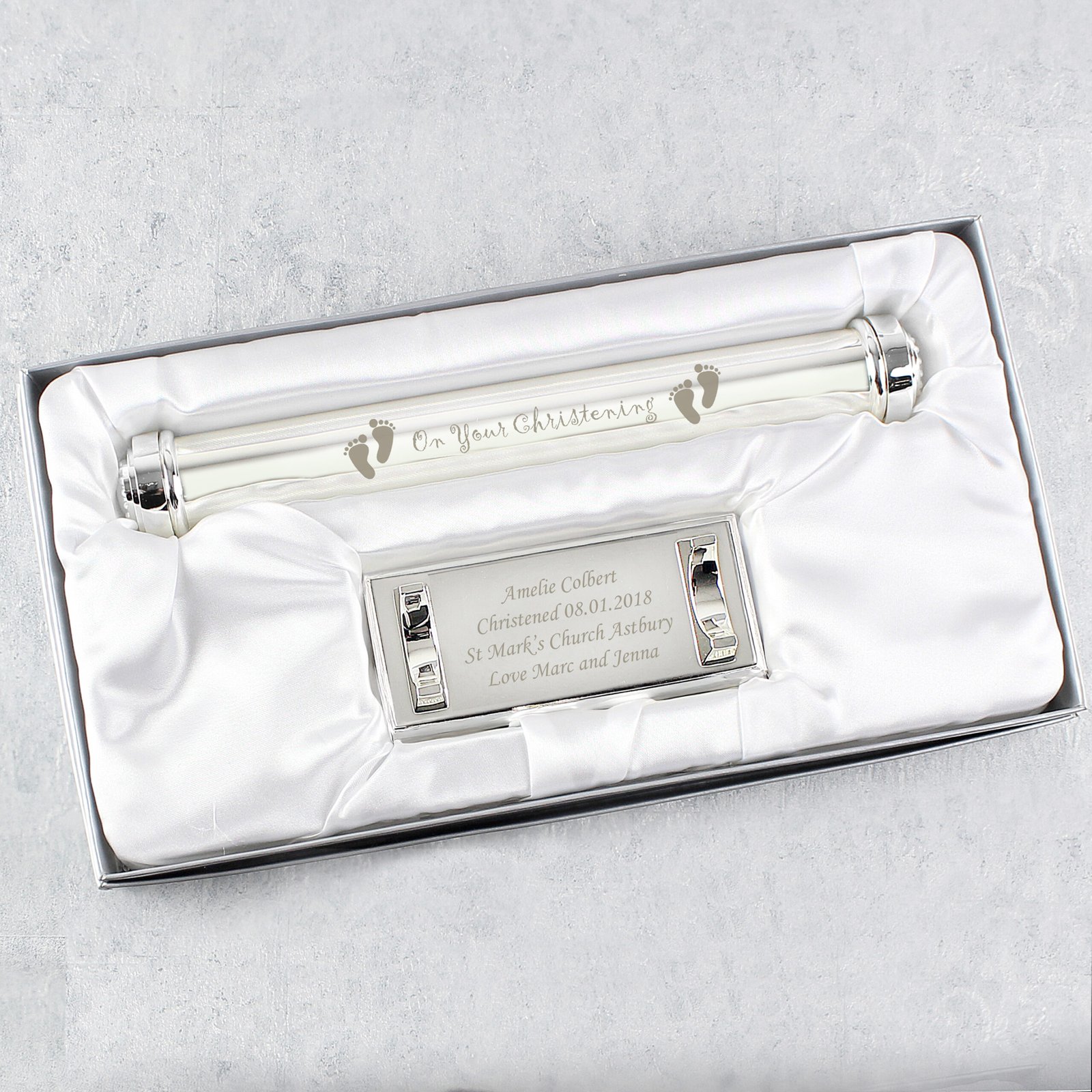 Celebrate a precious moment with this elegant Personalised ‘On Your Christening’ Silver Plated Certificate Holder. Beautifully designed with a charming footprints motif, this timeless keepsake is perfect for storing and displaying a child’s Christening certificate in style.
