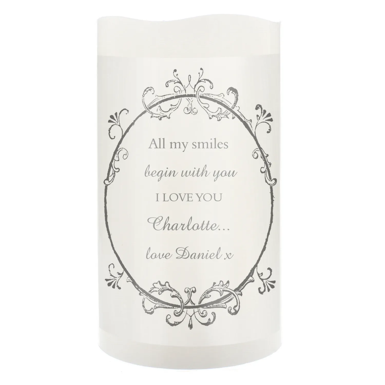 Create a warm and meaningful atmosphere with this elegant Personalised Ornate Frame Design LED Pillar Candle. Combining classic styling with a soft flickering glow, this beautiful keepsake is perfect for celebrating special moments or adding a personal touch to any space.