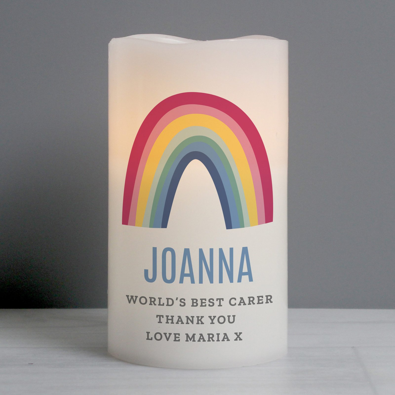 Illuminate their space with this charming Personalised Any Message Rainbow Design LED Pillar Candle—a beautiful and safe alternative to real candles. Perfect for adding a warm glow to any room, this candle can be personalised to make it truly unique and meaningful.