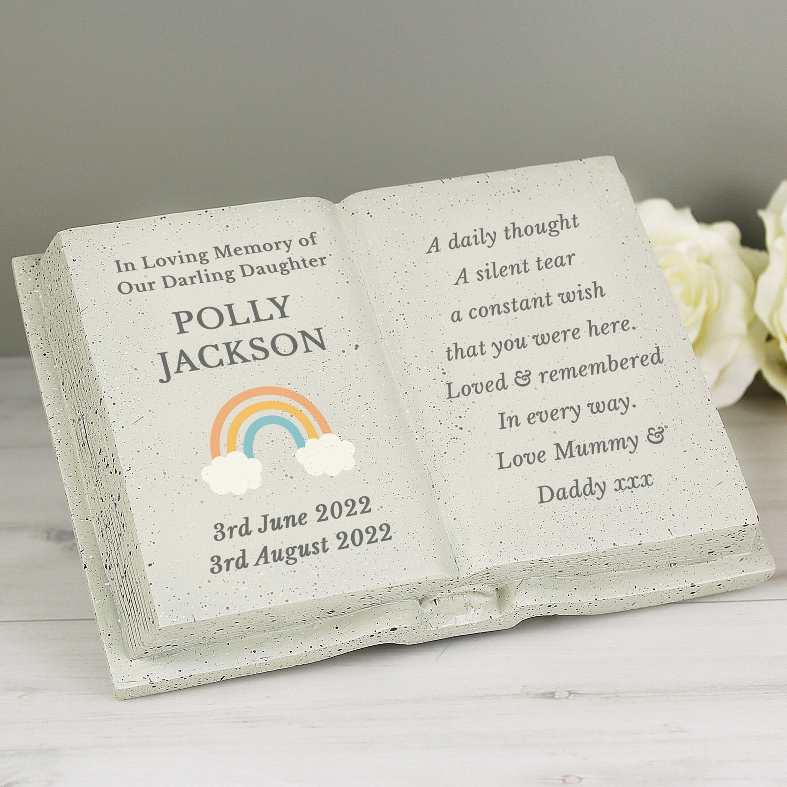 A thoughtful and lasting way to remember a loved one, this Personalised Rainbow Resin Memorial Book Ornament is a meaningful keepsake for any garden or graveside.