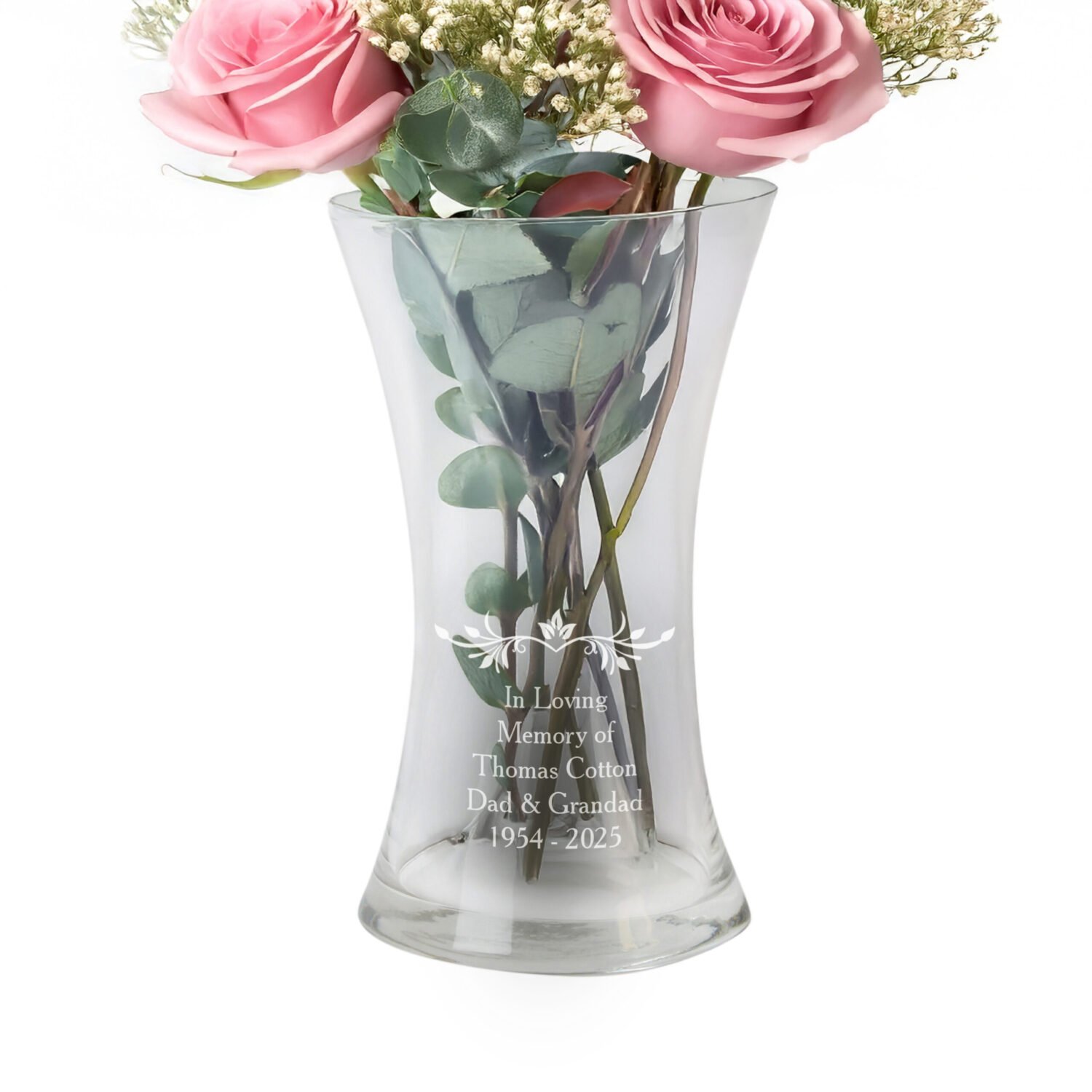Celebrate special moments with the elegance of this Personalised Sentiments Leaf Design Shaped Glass Vase – a beautiful and thoughtful gift that brings charm to any home.