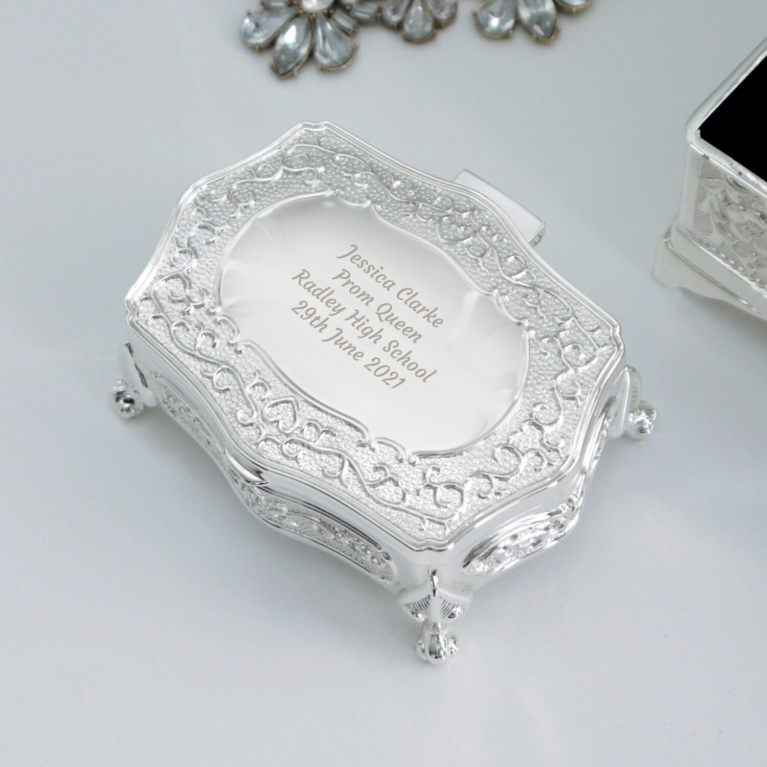 Elegant and timeless, this Personalised Small Antique Style Silver Finish Trinket Box makes a beautiful gift for someone special. With delicate antique styling and space for a heartfelt message on the lid, it’s perfect for storing jewellery, keepsakes, or sentimental treasures.