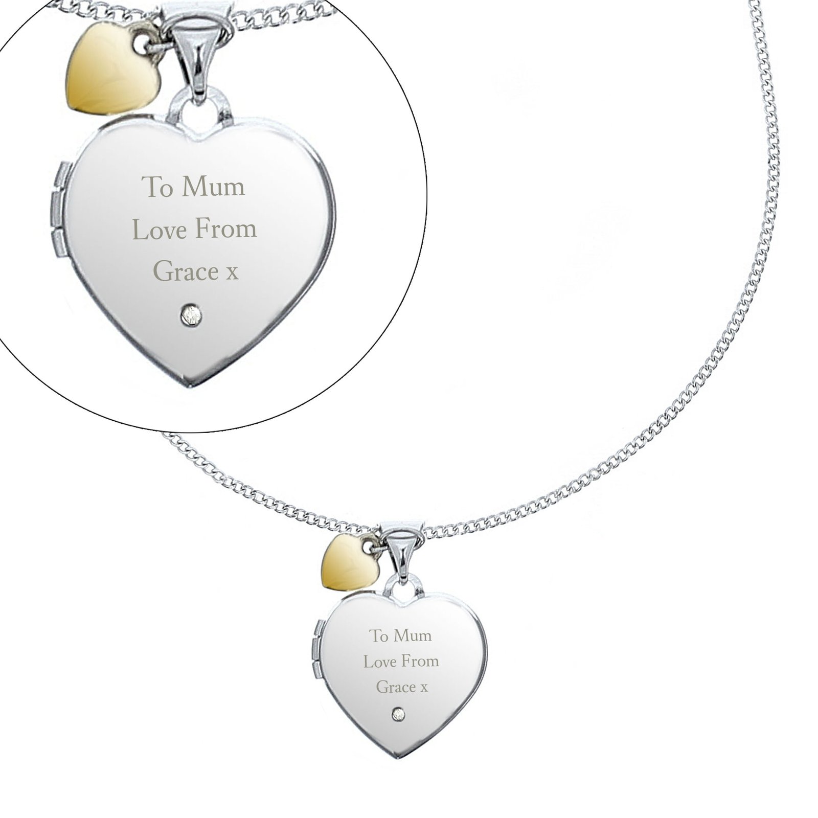Personalised Any Message Sterling Silver Heart Locket Necklace with Diamond & 9ct Gold Charm
