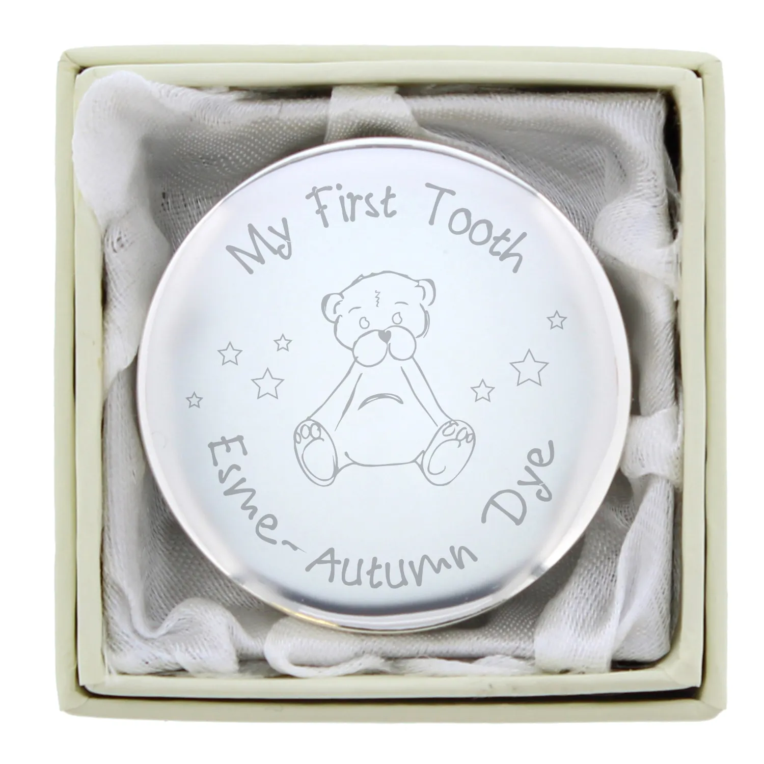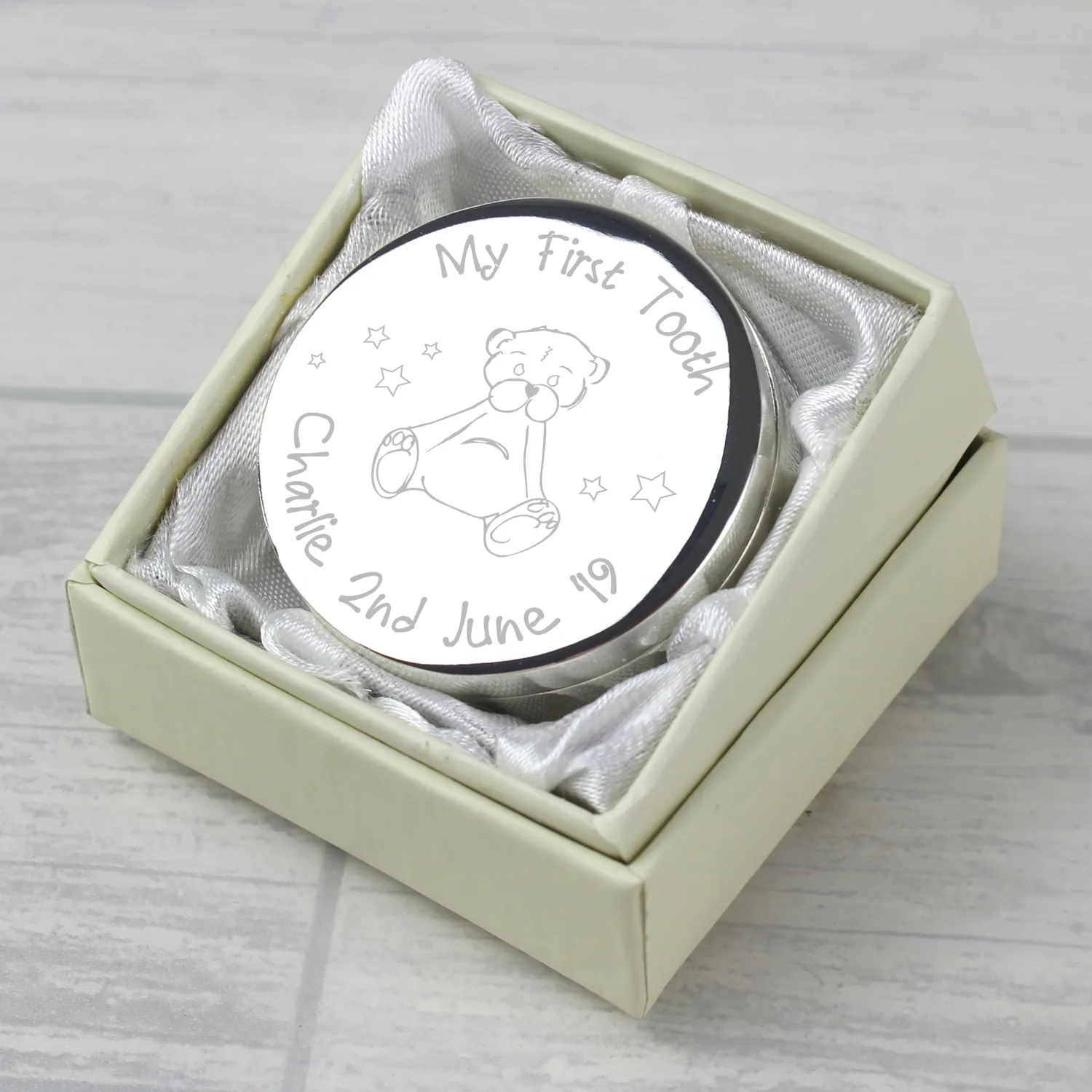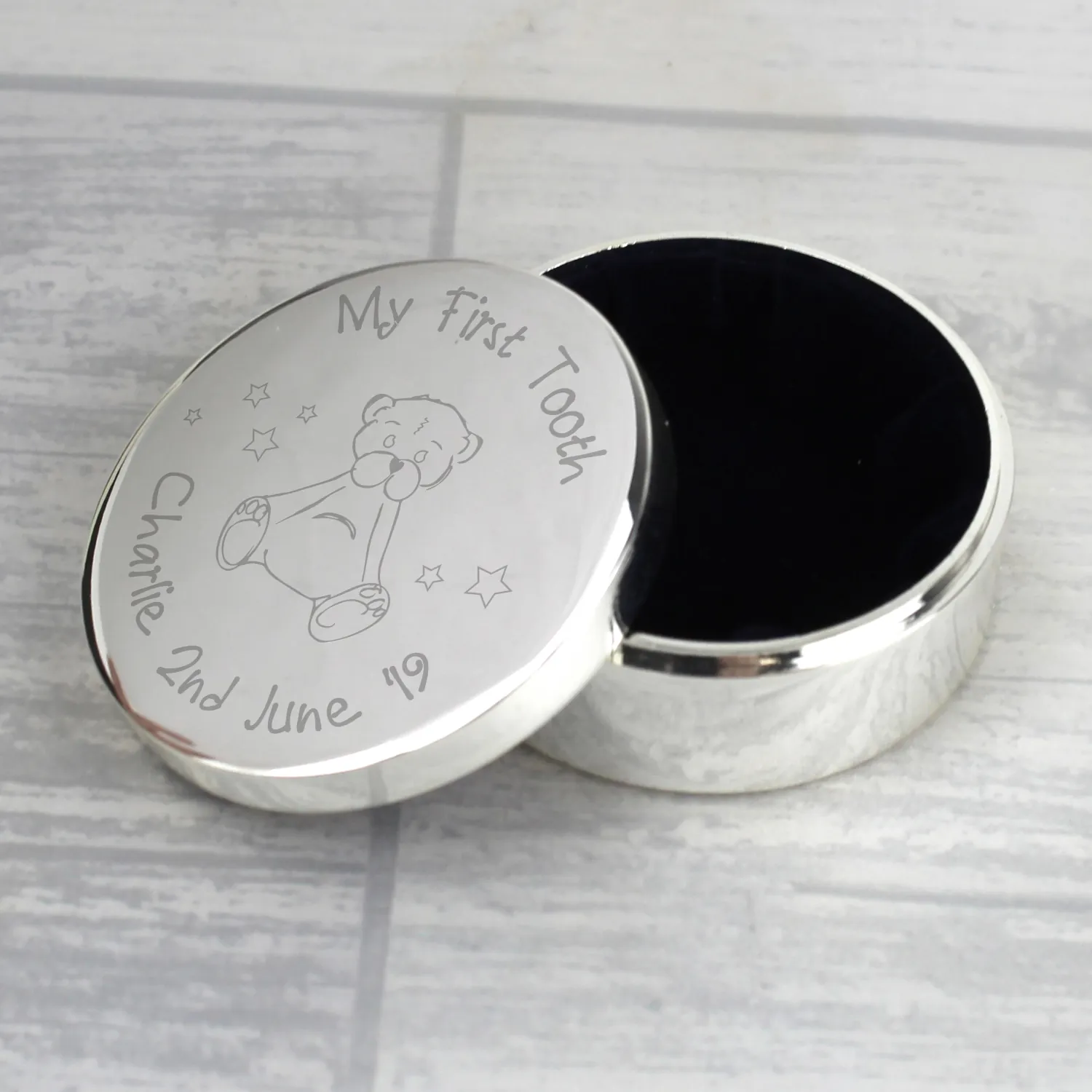 Personalised Any Message Teddy Motif ‘My First Tooth’ Silver Finish Trinket Box
