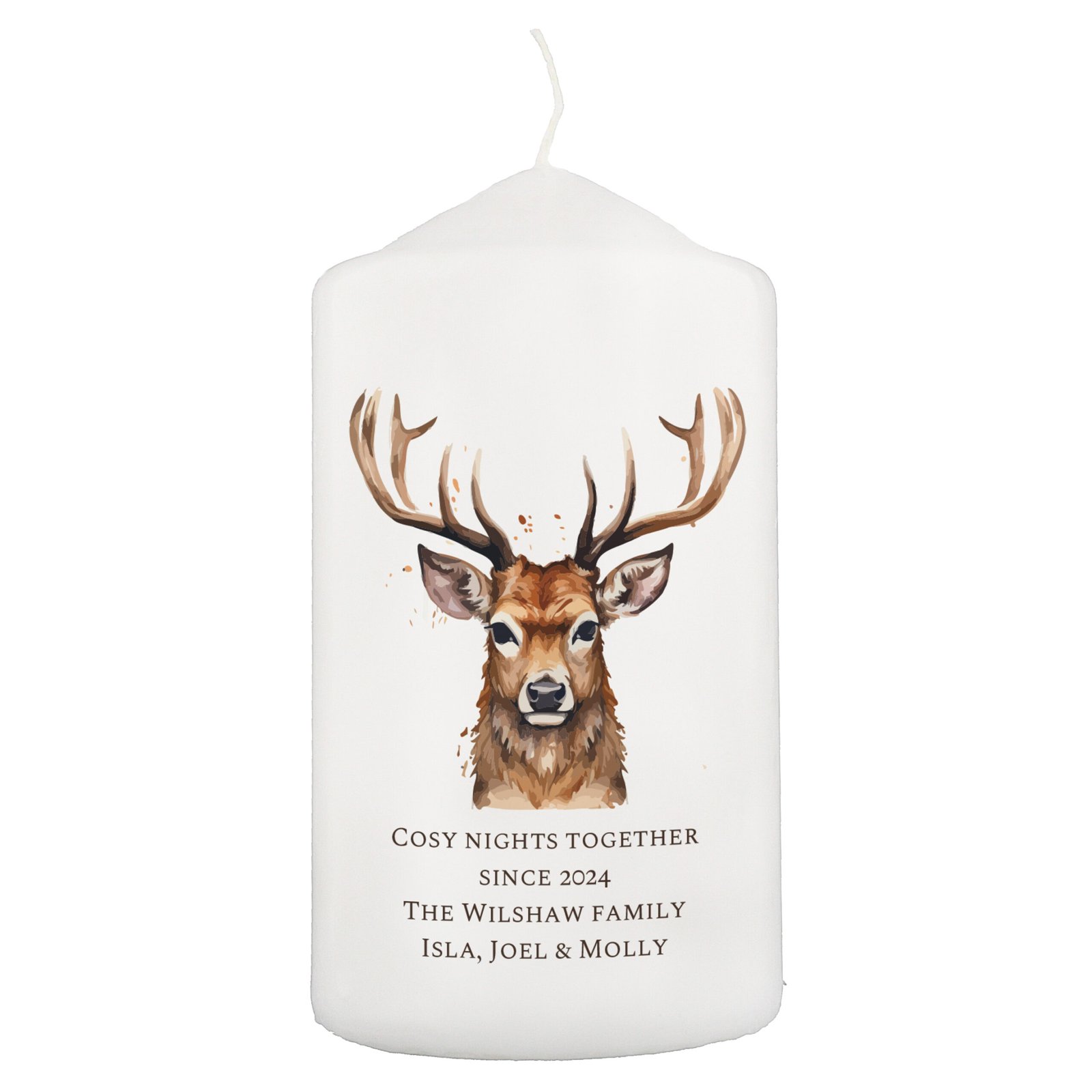 Illuminate your home with warmth, style, and personal meaning this festive season with the Personalised Watercolour Stag Design Christmas Pillar Candle — a timeless decoration that beautifully celebrates the spirit of Christmas.